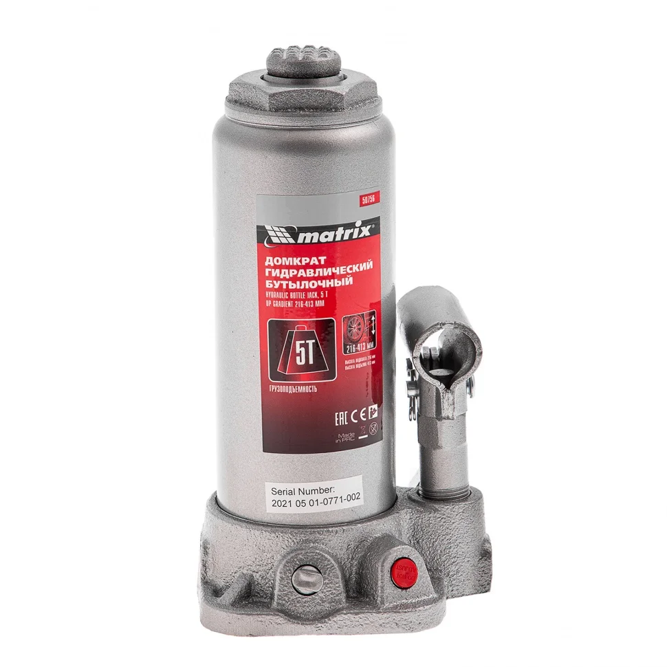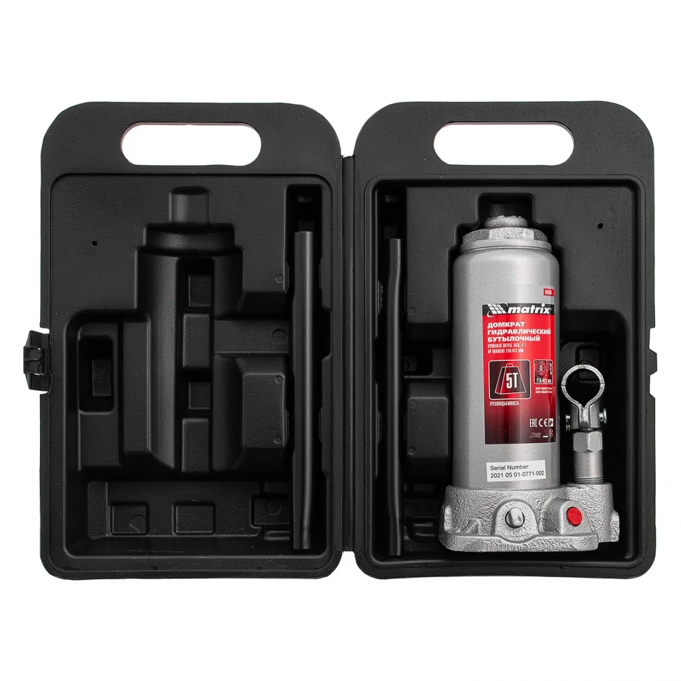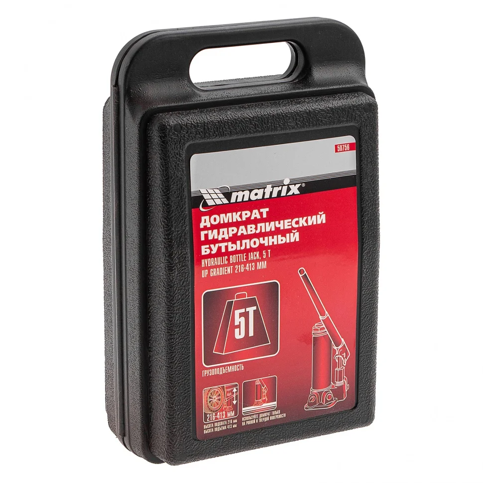 Домкрат гидравлический бутылочный, 5 т, высота подъема 216-413 мм, в пластиковый кейсе Matrix 50756
