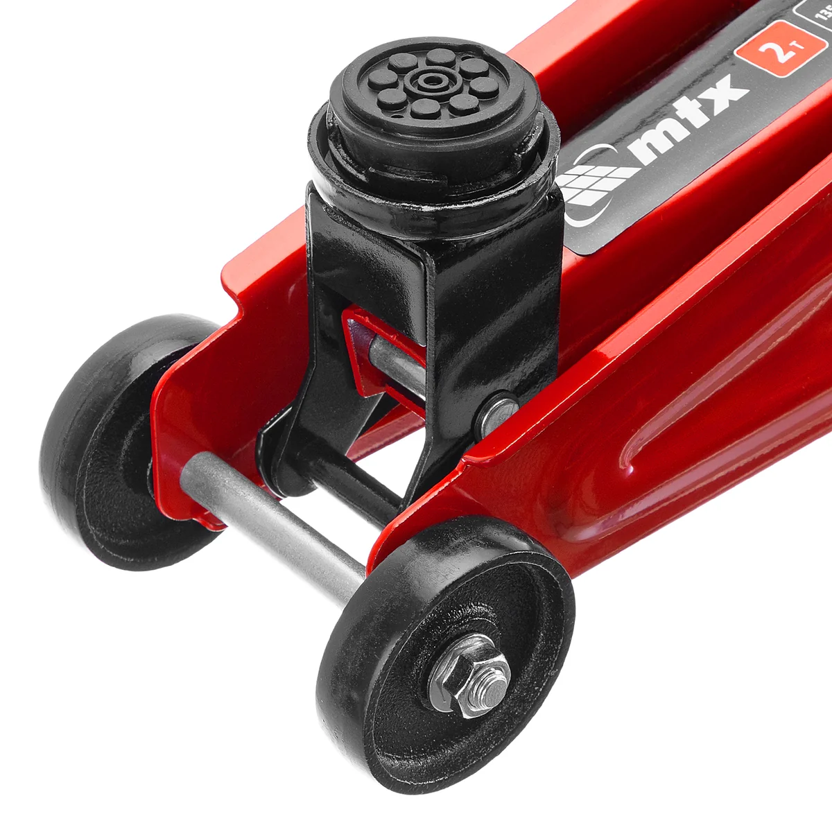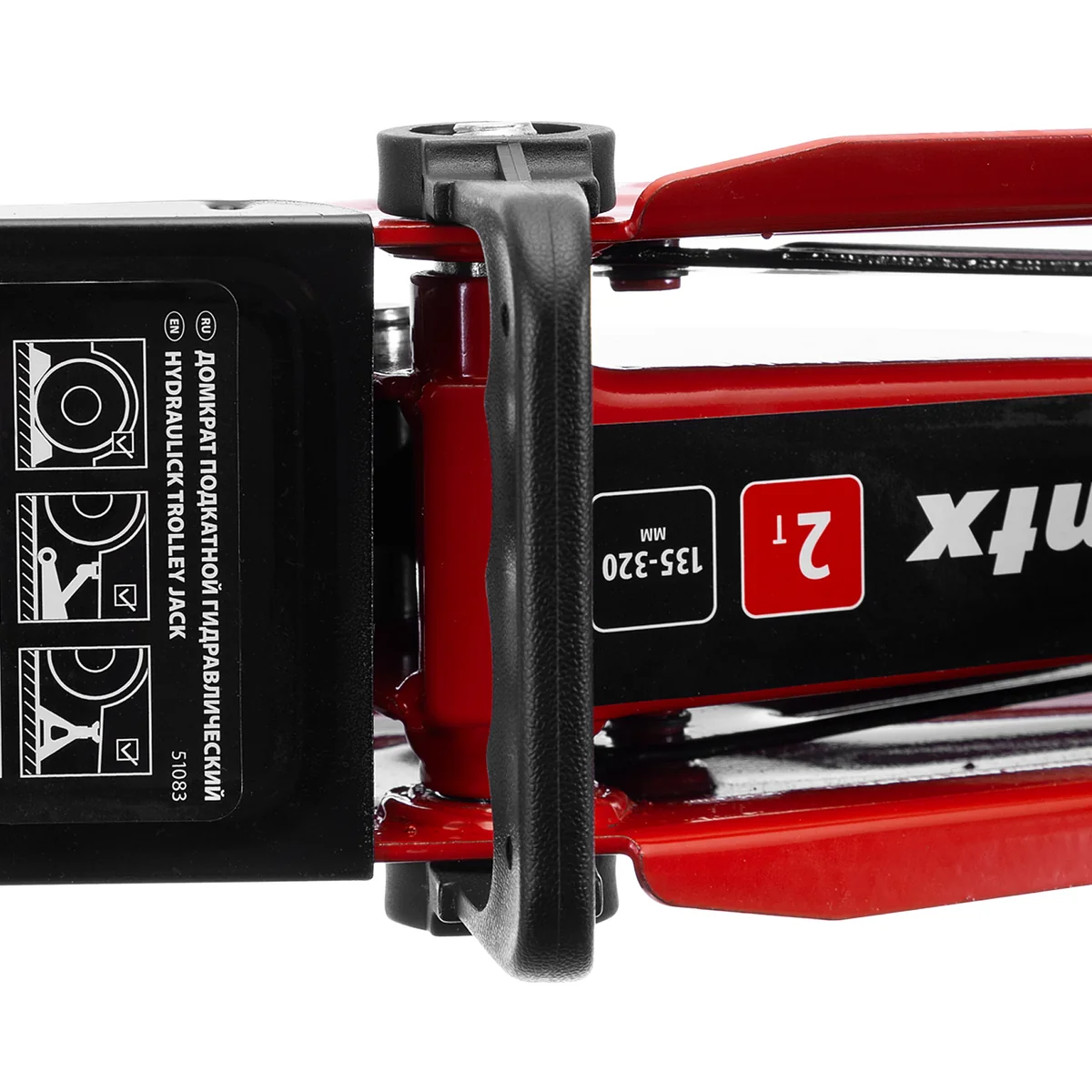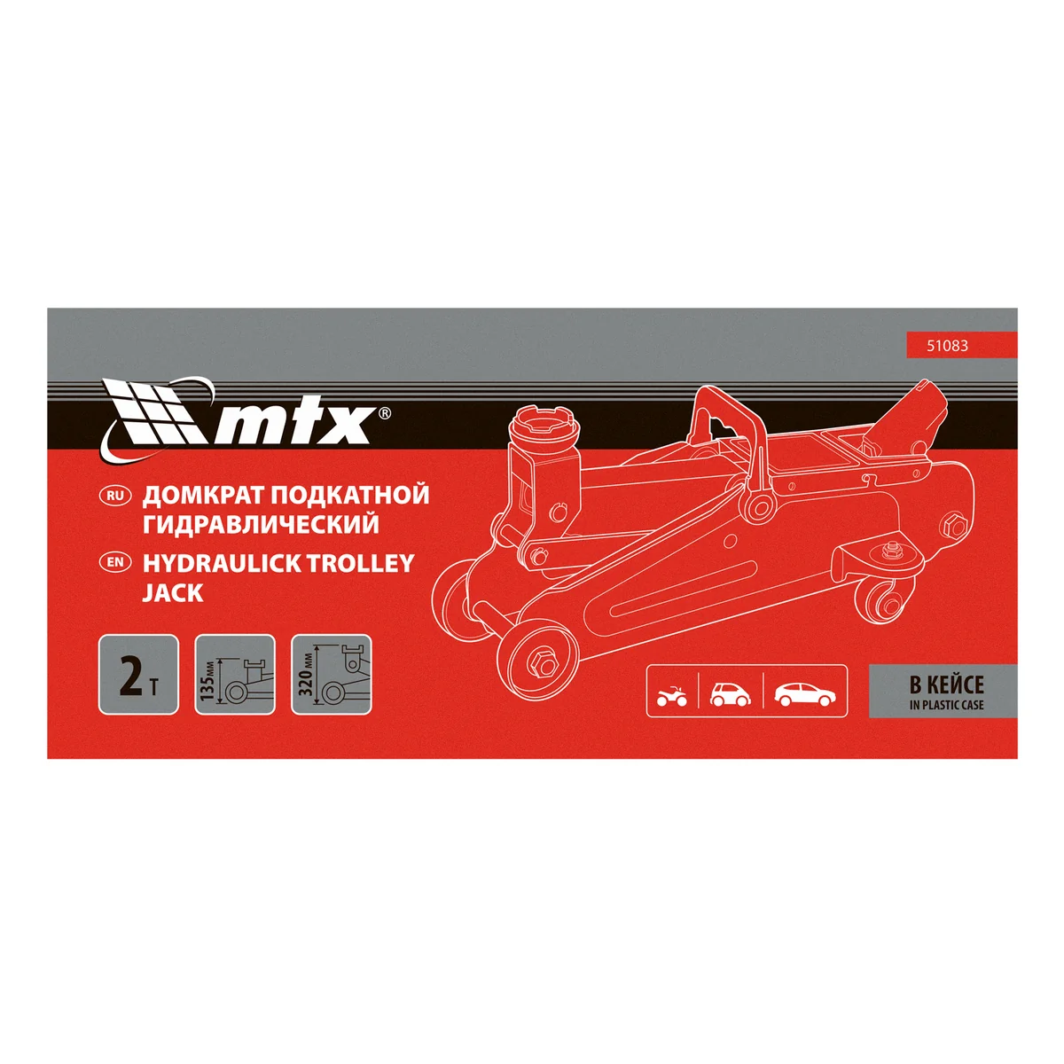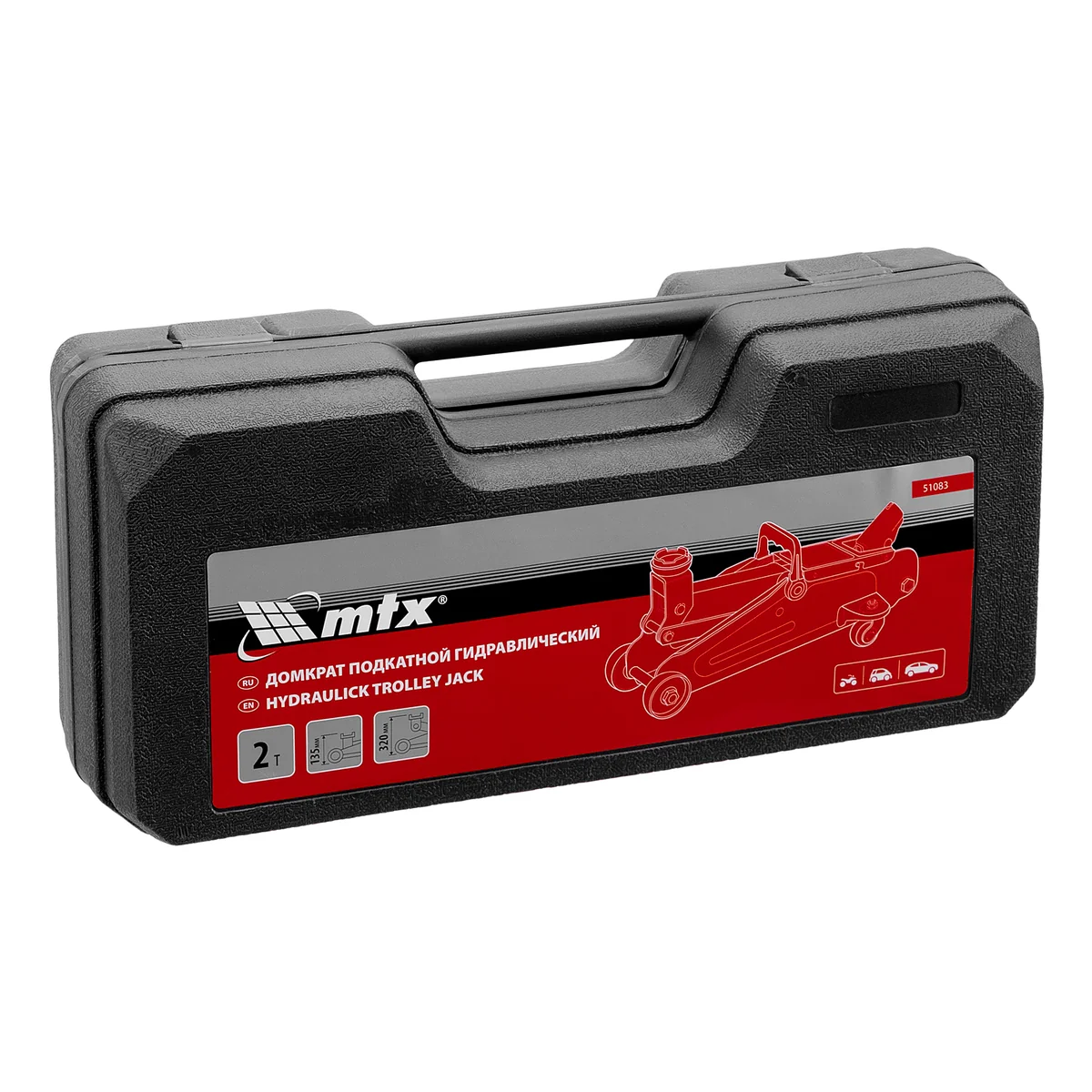 Гидравлический подкатной домкрат MTX 51083, поставляющийся в пластиковом кейсе, с высотой подхвата 135 мм, предназначен для подъема грузов массой до 2 т на высоту до 320 мм. Применяется для обслуживания автомобилей со стандартным клиренсом. Компактный домкрат подходит для самостоятельного использования автовладельцами.
