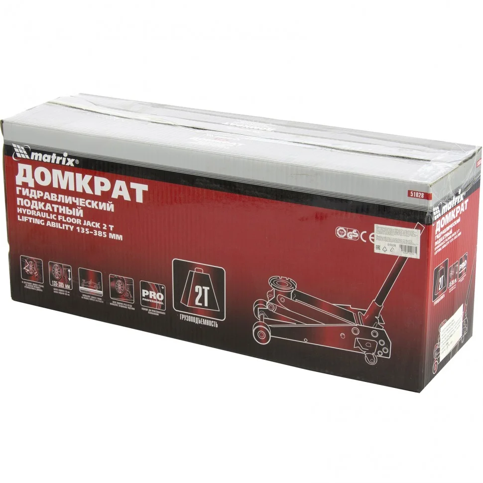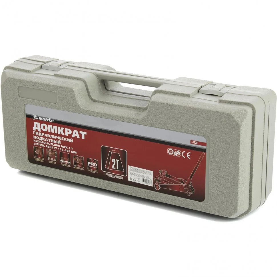 Подкатной гидравлический домкрат Matrix 51028 с высотой подхвата 135 мм, поставляющийся в пластиковом кейсе, — полупрофессиональное гаражное оборудование, способное поднимать груз массой до 2 т на высоту до 385 мм. Высота подхвата 135 мм позволяет использовать домкрат для автомашин со стандартным клиренсом. Домкрат будет полезен как в автомастерской, так и в частном гараже.ПреимуществаНадежность — усиленная конструкция выдерживает интенсивное использование.Коррозионная стойкость — на инструмент нанесено защитное покрытие.Безопасная эксплуатация — предохранительный клапан препятствует подъему груза массой более 2 т, предотвращая поломку домкрата.Мобильность — благодаря транспортировочной ручке домкрат удобно перемещать по рабочей зоне.Компактность — домкрат размером 535 х 225 х 140 мм легко помещается в багажник автомобиля.Удобное хранение и транспортировка — домкрат поставляется в пластиковом кейсе.