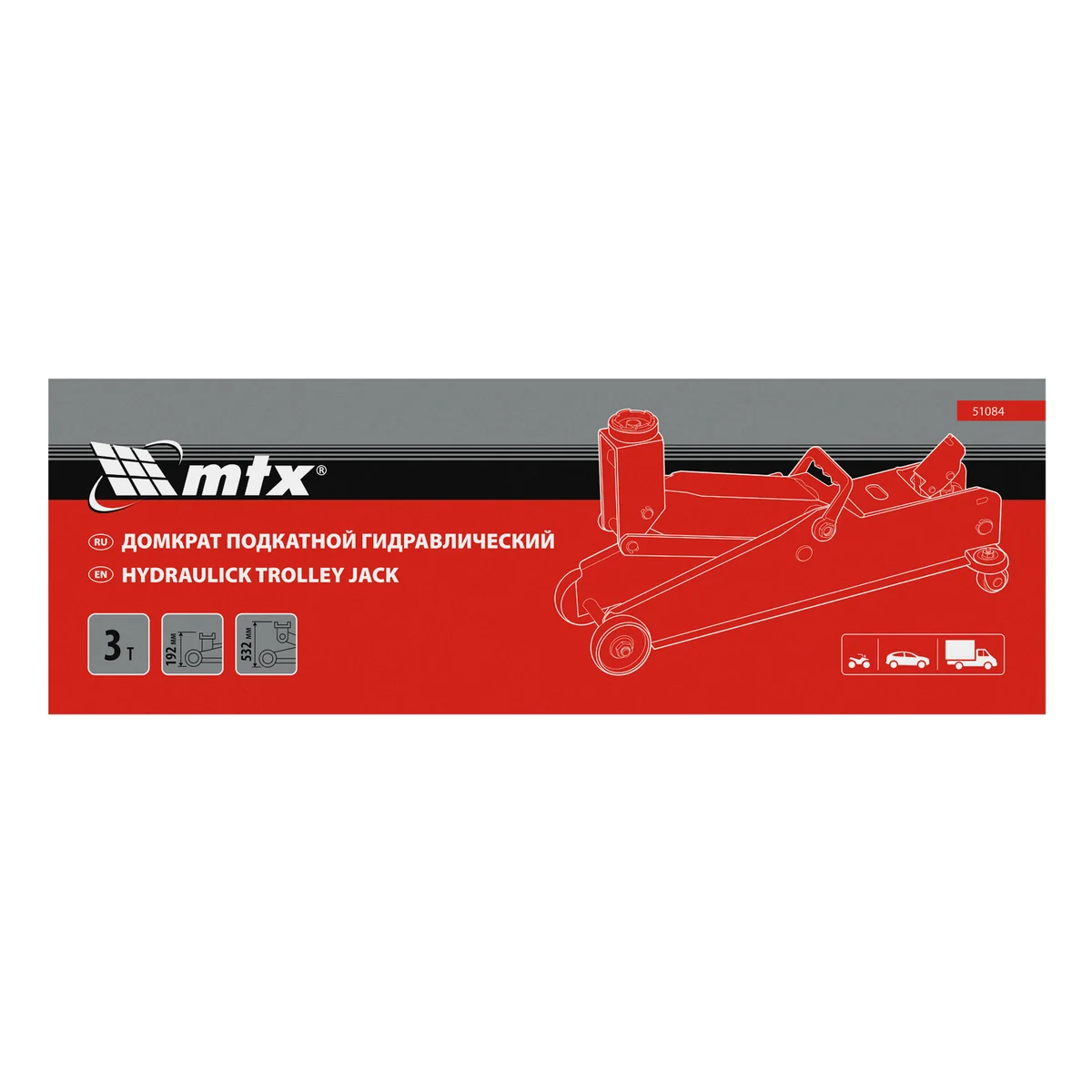 Гидравлический подкатной домкрат MTX 51084 с высотой подхвата 192 мм, предназначен для подъема грузов массой до 3 т на высоту до 532 мм, подходит для автомобилей со стандартным клиренсом и SUV (внедорожников). Компактный домкрат подходит для самостоятельного использования автовладельцами.