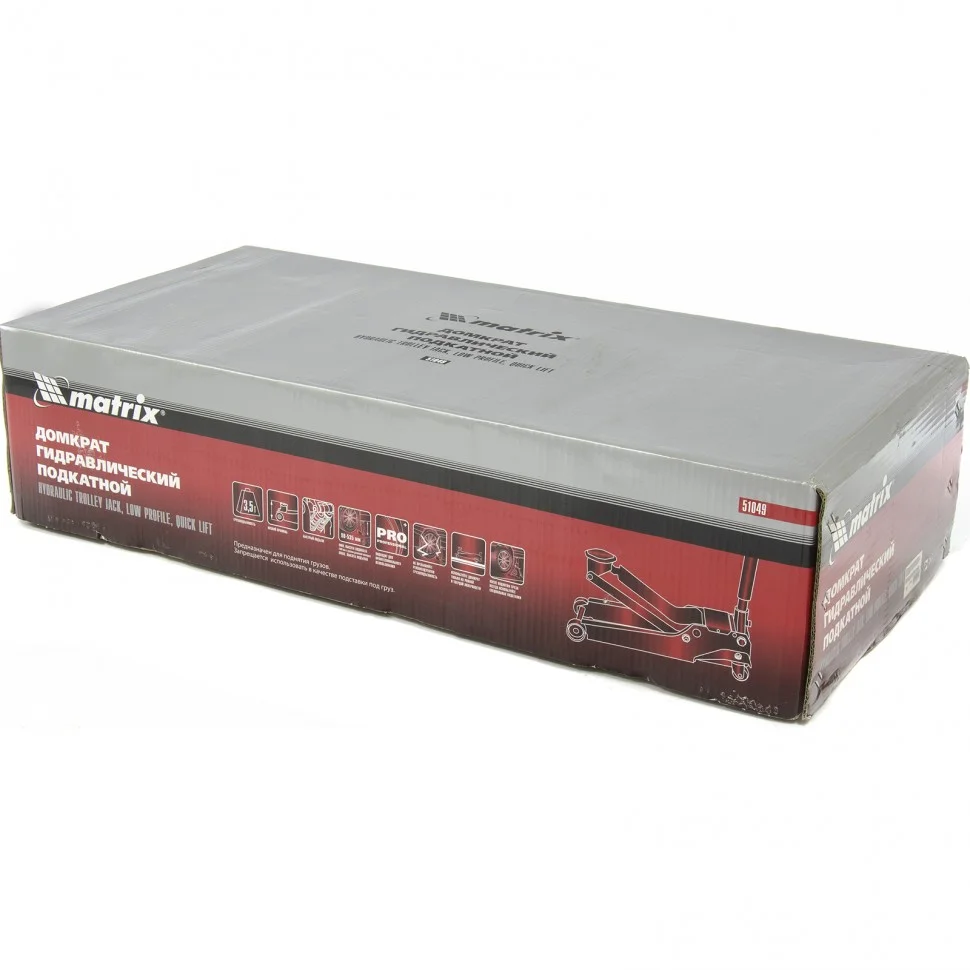 Подкатной гидравлический домкрат Matrix Low Profile Quick Lift 51049 с системой быстрого подъема на высоту 98-535 мм — профессиональное гаражное оборудование, способное поднимать груз массой до 3,5 т. Высота подхвата 98 мм позволяет использовать домкрат для автомашин с низким клиренсом и увеличенной высотой. Домкрат будет полезен в шиномонтажном центре и автосервисе.ПреимуществаСистема быстрого подъема Quick Lift — опорная площадка поднимается за 10 качков рукоятки.Коррозионная стойкость — на инструмент нанесено защитное покрытие.Безопасная эксплуатация — предохранительный клапан препятствует подъему груза массой более 3,5 т, предотвращая поломку домкрата.Высокая скорость подъема и удобство работы — подъемный механизм имеет двухплунжерную конструкцию.Высокий ресурс — карданный механизм отличается износостойкостью.Защита груза от повреждений — в комплект поставки входит резиновая накладка для опоры, на рукоятке имеется мягкая накладка.