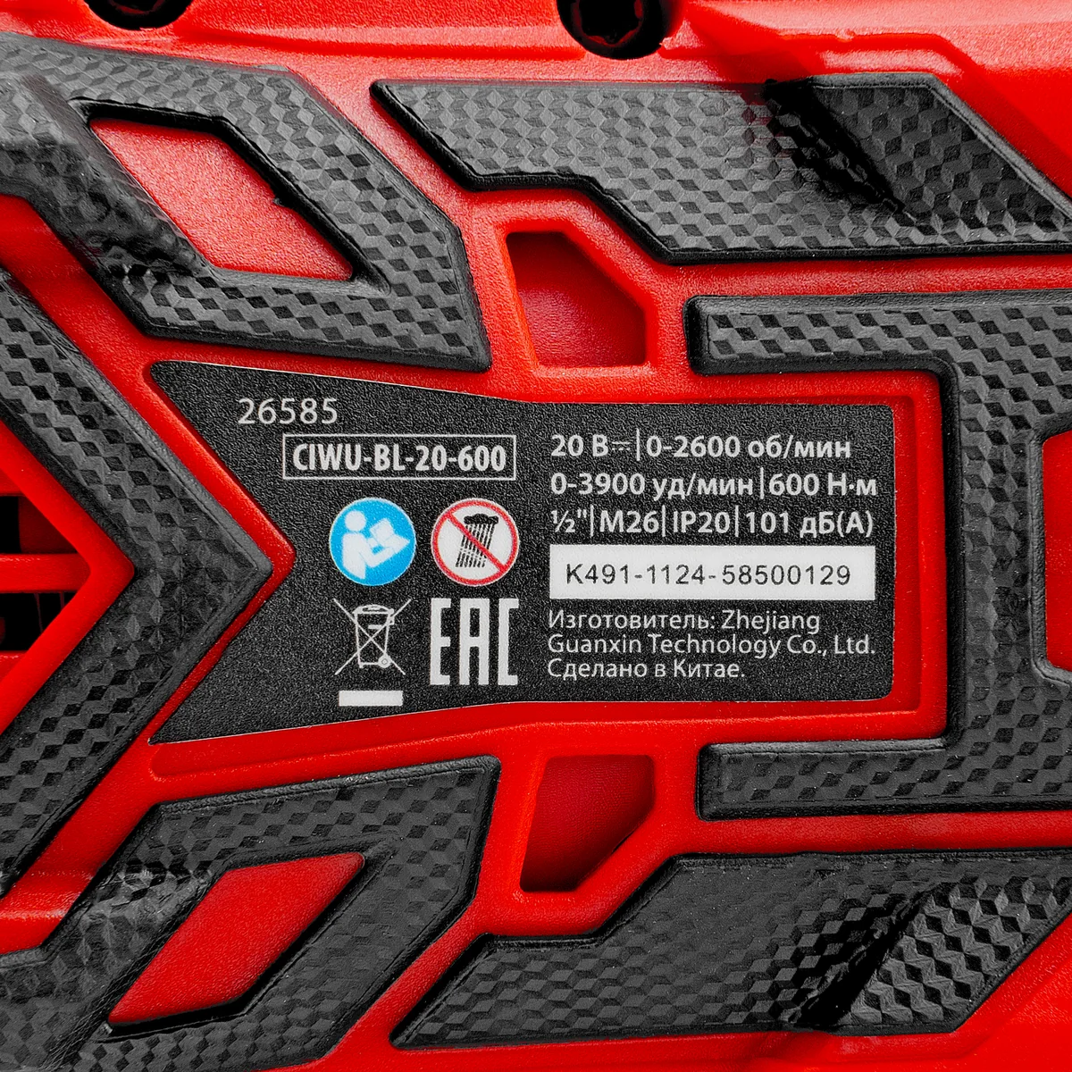 Гайковерт ударный аккумуляторный бесщет. CIWU-BL-20-600, Li-Ion, 20 В MTX 26585