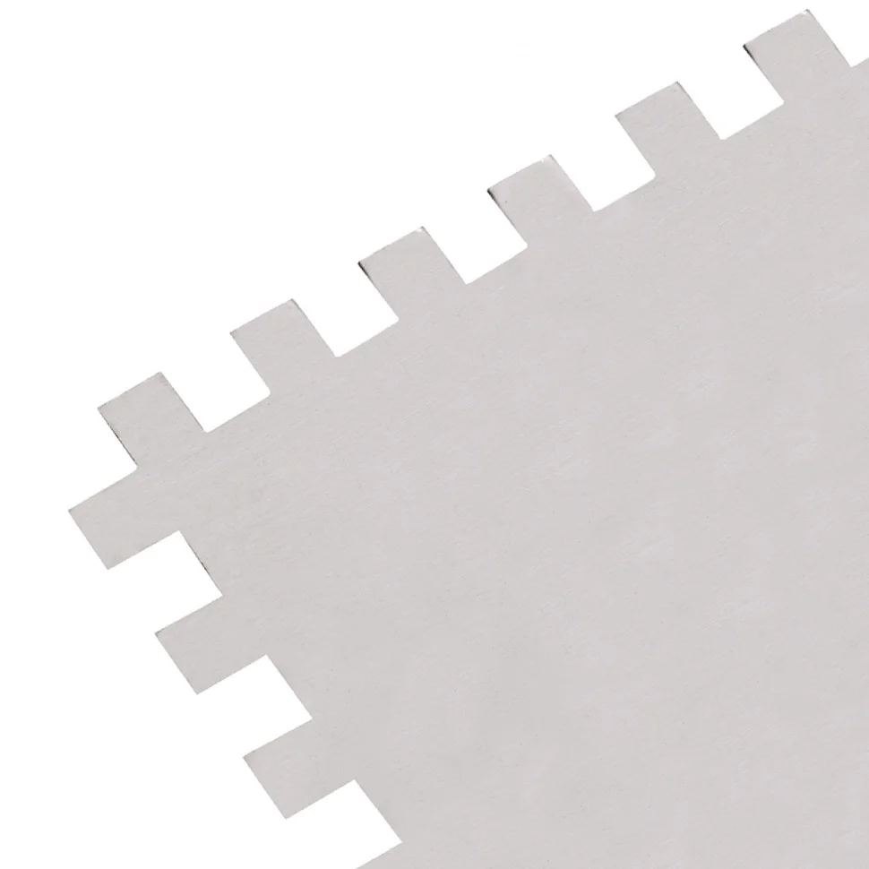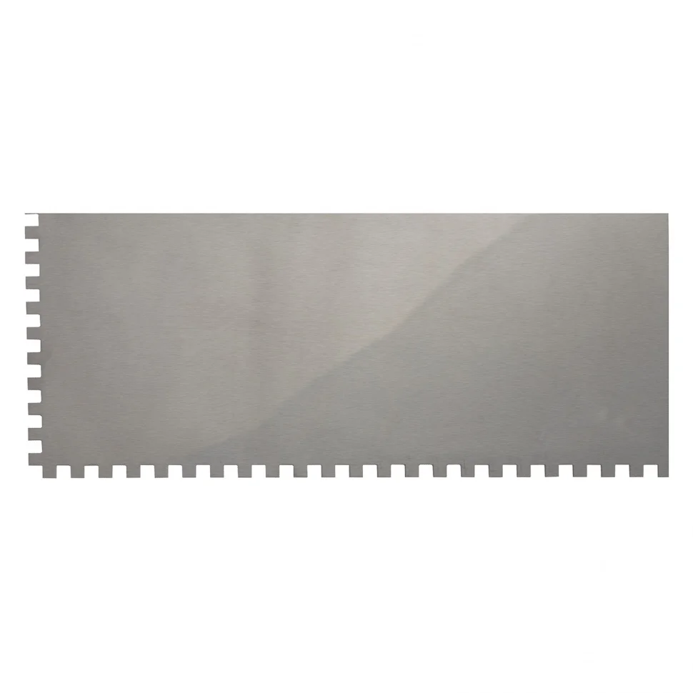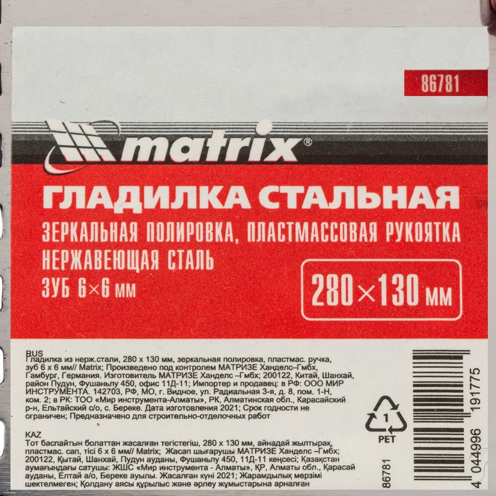Гладилка Matrix 86781 размером 280 x 130 мм, из нержавеющей стали, с зубьями 6 x 6 мм, зеркальной полировкой и пластмассовой ручкой, пригодится любителям и частным мастерам при проведении ремонтных работ. Она позволяет равномерно наносить строительные растворы и плиточный клей на подготовленные под отделку поверхности.ПреимуществаДолговечность — гладилка из нержавеющей стали не боится коррозии, обладает оптимальным соотношением упругости и прочности.Высокое качество работ — отполированное полотно обеспечивает максимально равномерное распределение растворов, в том числе быстрозастывающих.Комфортная эксплуатация — эргономичная пластиковая ручка удобно лежит в руке, что позволяет долго работать без усталости.