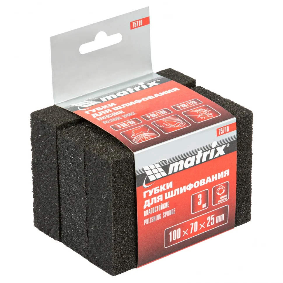 Губка для шлифования средней жесткости Matrix 75710, 100 х 70 х 25 мм, входит в набор из 3 губок. Каждая из губок покрыта абразивом с 4-х сторон, при этом с двух сторон имеет разную зернистость - P 60/80, P 60/100, P 80/120. Они используются для черновой и чистовой шлифовки деревянных, пластиковых, металлических, шпаклеванных поверхностей, удаления слоя краски и ржавчины. Абразивная губка пригодится для проведения строительных, ремонтных, кузовных работ, будет полезна в изготовлении мебели и в быту.Преимущества Средняя жесткость - губка подходит для обработки металлических поверхностей, углов, кромок. Абразивный материал - твердый оксид алюминия, а значит, губка отличается износостойкостью и справляется с большим объемом работ. Универсальный тип - прямоугольные губки подходят для обработки поверхностей различной формы. Водостойкость - губка пригодна для мокрой шлифовки, а после окончания работ ее можно промывать в воде.