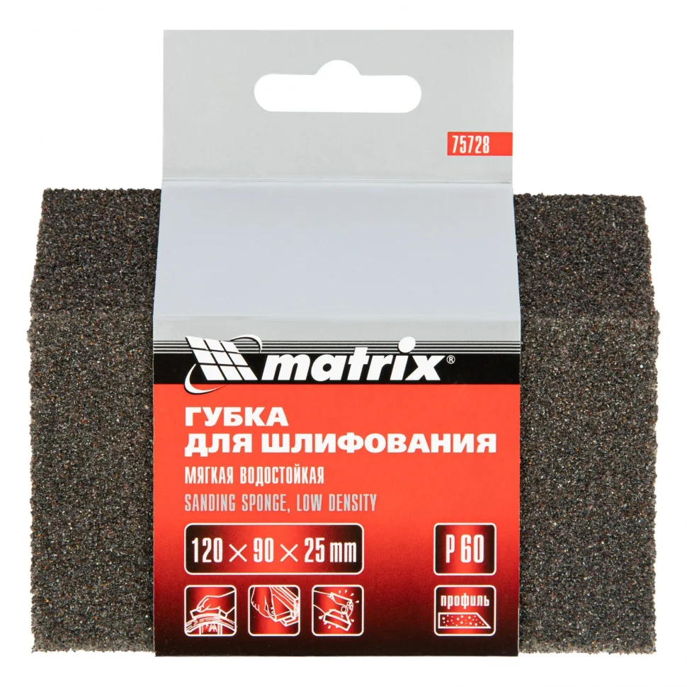 Губка для шлифования Matrix 75728 P 60, 120 x 90 x 25 мм, трапеция, используется для ручной обработки дерева, пластика, металла. Благодаря размерам зерна 250-315 мкм она эффективно удаляет краску, ржавчину, грубые неровности. Применяется при отделочных работах, кузовном ремонте, изготовлении мебели.Преимущества Благодаря скошенному краю губки ею можно обрабатывать узкие места, углы, пазы и труднодоступные поверхности. Крупнозернистый абразив P 60 из твердого оксида алюминия позволяет с высокой эффективностью проводить черновую шлифовку даже при большом объеме работ. Мягкая поролоновая основа позволяет шлифовать рельефные поверхности. Губка водостойкая, поэтому ее можно использовать для мокрой шлифовки и промывать для повторного применения. Абразивный слой нанесен на губку с 4-х сторон, поэтому она прослужит долгое время.