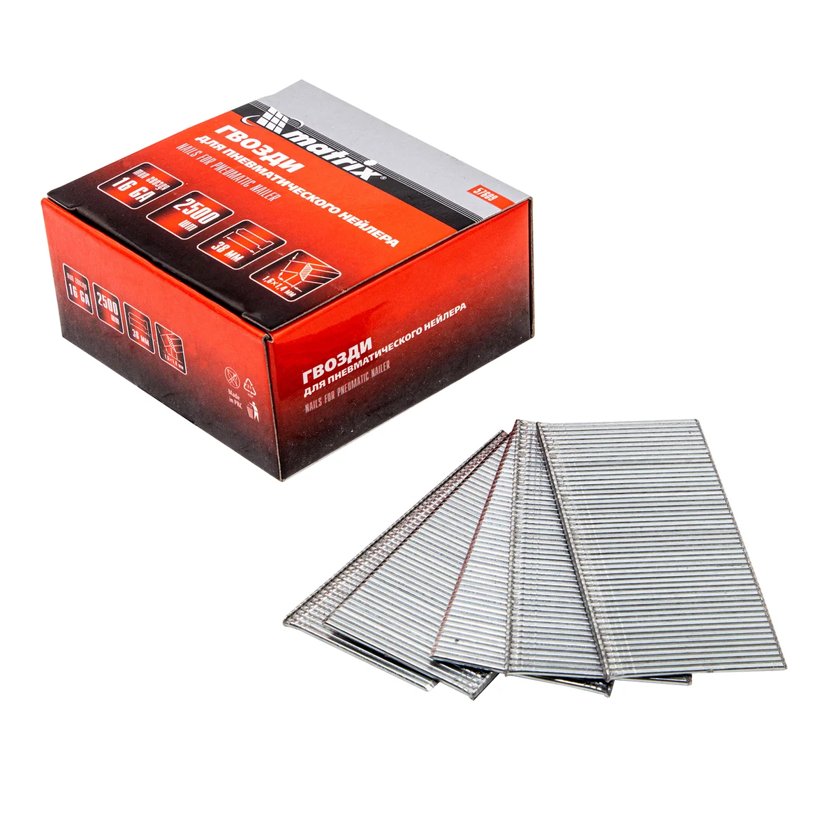 Гвозди Matrix 57609, тип 16GA для пневматического нейлера позволяют быстро выполнять монтажные и строительные работы с деревянными и металлическими поверхностями, тканями, ДСП и другими не очень твердыми материалами. Подходят для нейлеров, работающих с отделочными штифтами размером 1,6 х 1,4 х 38 мм.Преимущества:Тип 16 GA обеспечивает высокую эффективность скрепления и долгий срок службы.Гвозди сделаны из углеродистой стали с антикоррозионным покрытием, что обеспечивает высокую прочность, защиту от разрушения и поломок.2500 штук в упаковке — одного комплекта хватает на долгое время.
