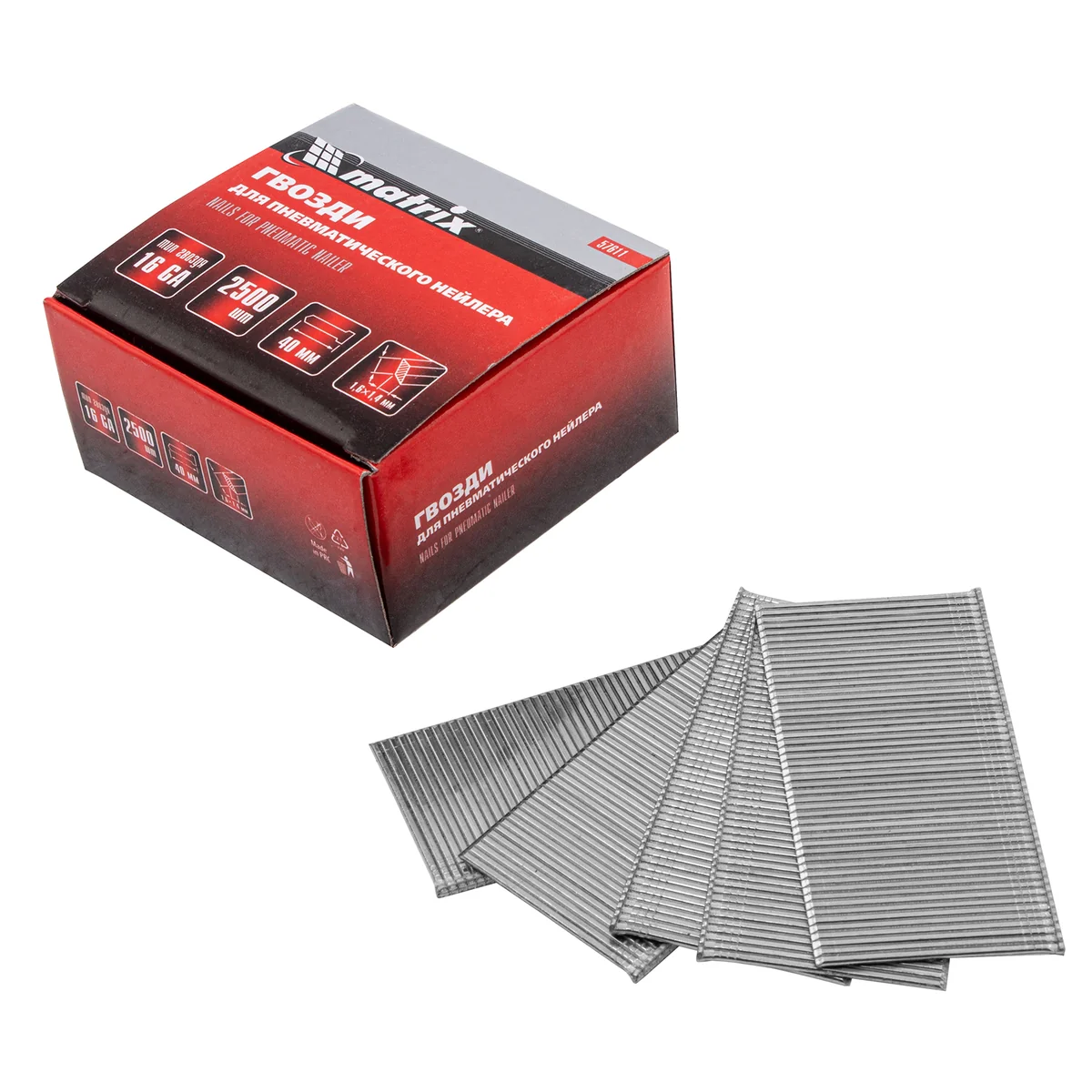 Гвозди Matrix 16 GA (арт. 57611) заправляются в пневмонейлеры любых торговых марок, работающие с оснасткой сечением 1,6 х 1,4 мм и длиной 40 мм. Они значительно облегчают проведение ремонтных и строительных работ, сборку мебели и обустройство интерьера в доме, ведь фиксация материалов к деревянным и металлическим поверхностям не требует сил.Преимущества:Стальная конструкция — гвозди отличаются прочностью и высокой устойчивостью к излому.Предотвращение коррозии — все штифты производятся с никелированным покрытием.Фасовка по 2500 штук — гвоздей хватит надолго.