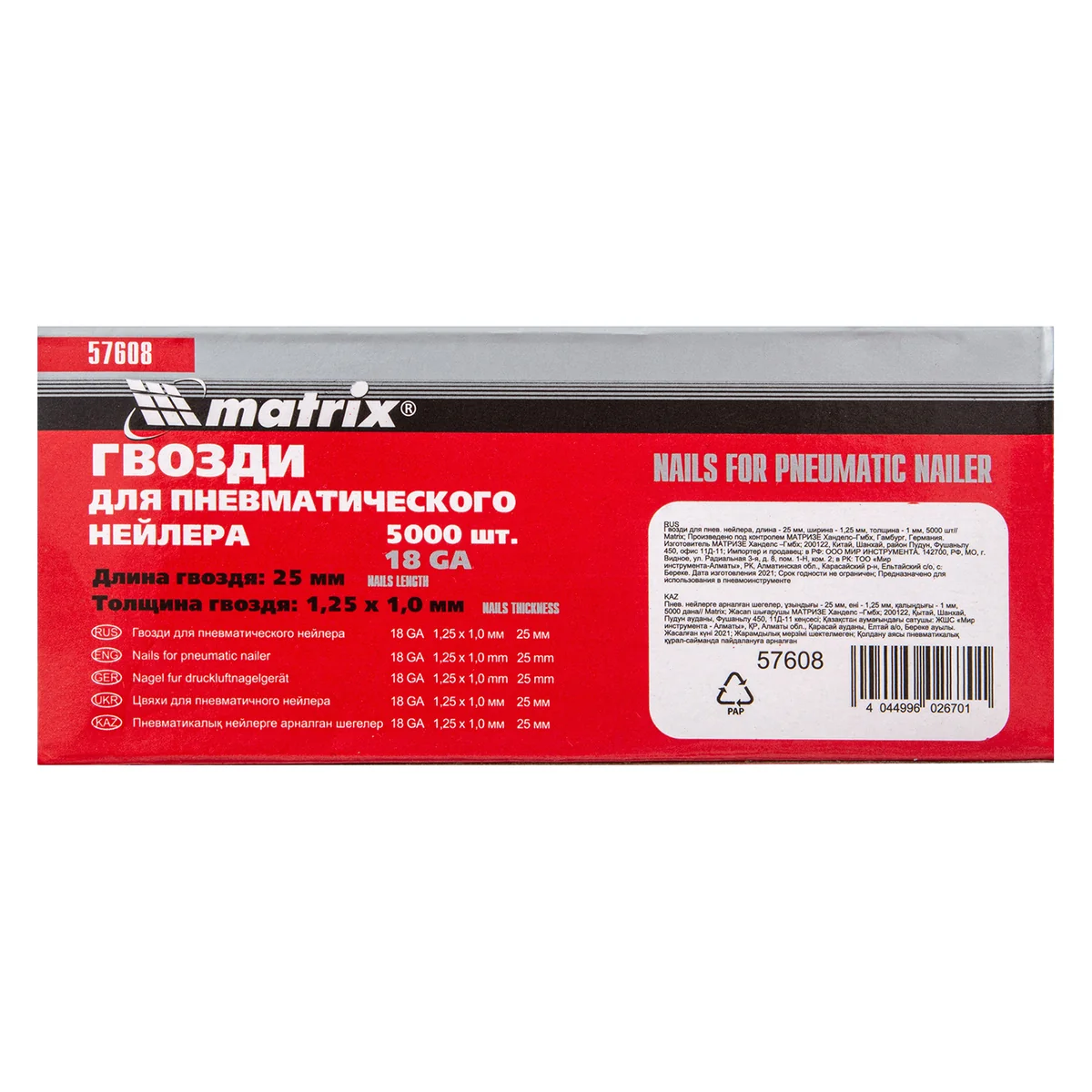 Гвозди Matrix 57608, тип 18 GA подходят к любым пневматическим нейлерам, работающим с оснасткой размером 25 х 1,25 х 1 мм. Позволяют без усилий соединять деревянные и металлические поверхности, проводить ремонтные и строительные работы.Преимущества:Высокая прочность — гвозди сделаны из углеродистой стали, поэтому не ломаются.Никелированное покрытие — исключено появление коррозии.Фасовка по 5000 штук — набора хватит на долгое время, в упаковках не встречается брак.