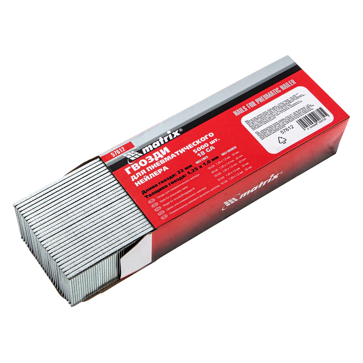 Гвозди Matrix 57612, тип 18GA, 5000 шт. в упаковке, предназначены для пневматических нейлеров, работающих с оснасткой размером 32 х 1,25 х 1 мм. Они обеспечивают быстрое и точное соединение деревянных деталей, помогают зафиксировать на деревянных и металлических поверхностях ткань, элементы дизайна, фурнитуру. ПреимуществаПрочность — стальные гвозди не ломаются при работе с твердыми поверхностями.Защита от коррозии — оснастка покрыта никелем, поэтому не боится преждевременного износа.Большой запас 5000 штук — одного набора гвоздей хватит для выполнения большого количества задач.