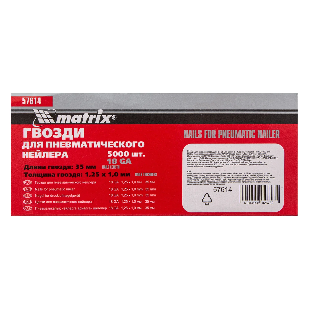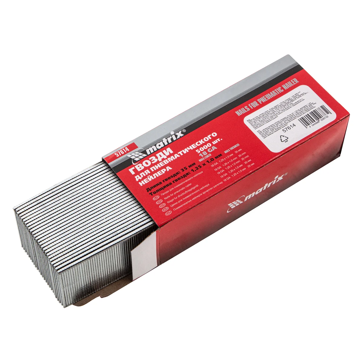 Гвозди Matrix 57614. тип 18 GA используются с пневматическими нейлерами от любых производителей, работающих с крепежом 35 х 1,25 х 1 мм. Оснастка гарантирует быстрое и надежное скрепление материалов из картона, фанеры, древесины, ДСП и других не очень твердых поверхностей. Использовать гвозди можно как в быту, так и на небольших производствах и в частных мастерских.Преимущества:Высокая прочность и защита от излома — гвозди сделаны из углеродистой стали.Никелированное покрытие — исключено образование коррозии и разрушение крепежа.5000 штук в каждой упаковке — оснастки хватит на долгое время.