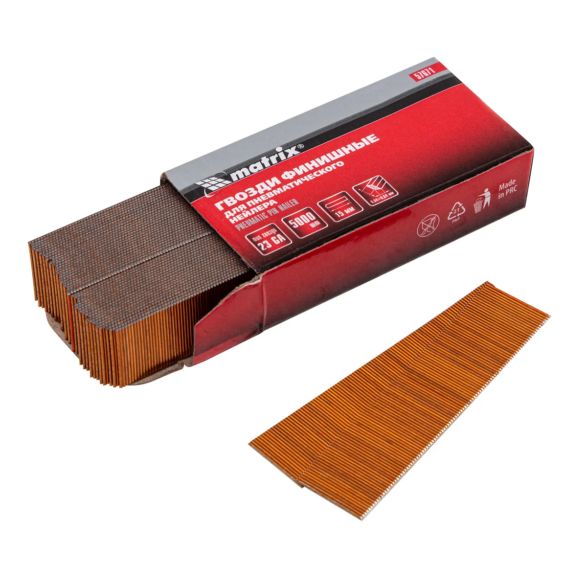 Гвозди финишные (шпильки) Matrix 23GA 57671 диаметром 0,64 мм и длиной 15 мм, 5000 шт., подойдут для работы с пневматическим нейлером любой торговой марки. Используются для быстрого и точного скрепления тонких деревянных материалов и конструирования декоративных элементов.ПреимуществаНезаметная фиксация — гвозди прекрасно справляются с декоративной обработкой материалов, когда важно, чтобы крепление оставалось невидимым, но надежным.Аккуратный результат — да со шпильками нет риска повредить лицевую сторону материала, что особенно важно для декоративных предметов интерьера.Надежность — гвозди выполнены из прочной инструментальной стали и закалены до необходимой твердости, что минимизирует риск их искривления.Большой запас — 5000 гвоздей хватит на долгое время даже при частом использовании.