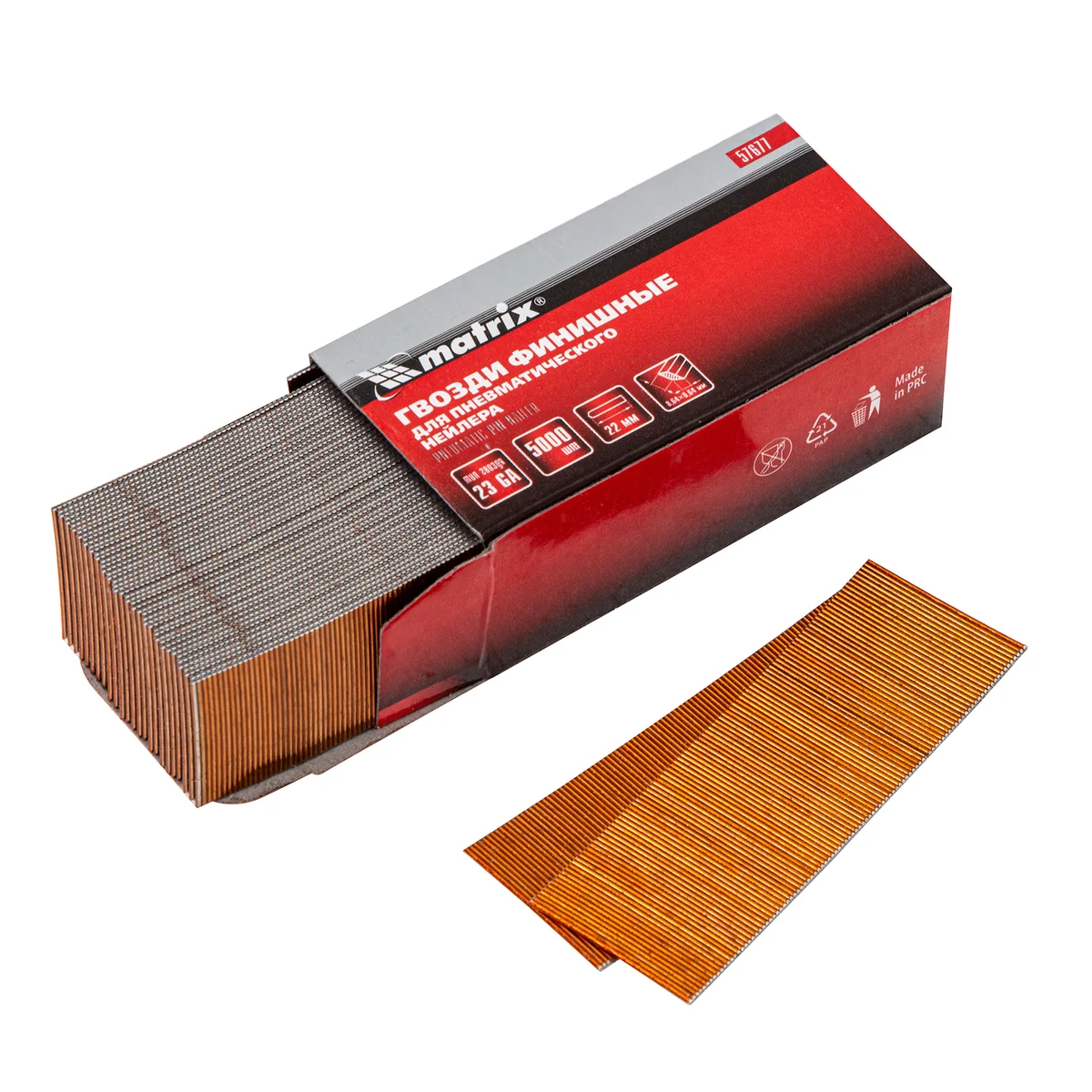 Гвозди финишные (шпильки) Matrix 23GA 57677 диаметром 0,64 мм и длиной 22 мм, 5000 шт., подходят для работы с любыми пневматическими нейлерами и широко используются в строительных, монтажных и ремонтных работах. Способны скреплять даже прочные древесные материалы, например, из ясеня и дуба. Могут применяться для декорирования потолка и стен, создания элементов дизайна и сборки мягкой корпусной мебели.ПреимуществаНезаметная фиксация — гвозди прекрасно справляются с декоративной обработкой материалов, когда важно, чтобы крепление оставалось невидимым, но надежным.Аккуратный результат — да со шпильками нет риска повредить лицевую сторону материала, что особенно важно для декоративных предметов интерьера.Надежность — гвозди выполнены из прочной инструментальной стали и закалены до необходимой твердости, что минимизирует риск их искривления.Большой запас — 5000 гвоздей хватит на долгое время даже при частом использовании.