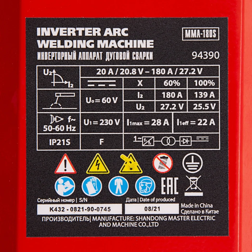 Инверторный аппарат дуговой сварки MMA-180S, 180 А, ПВ60%, диаметр электрода 1,6-4 мм 94390