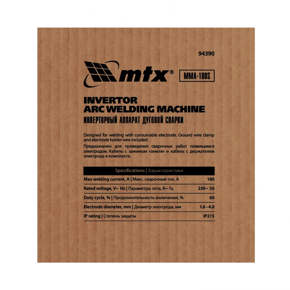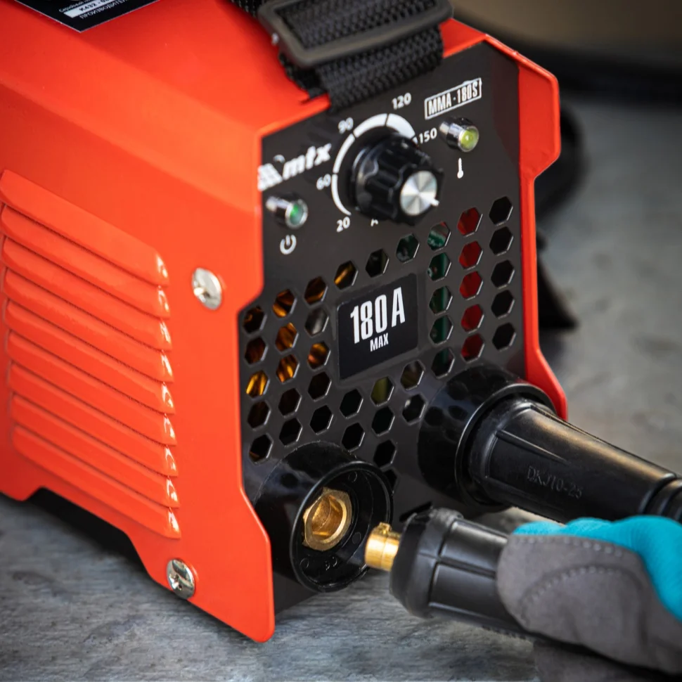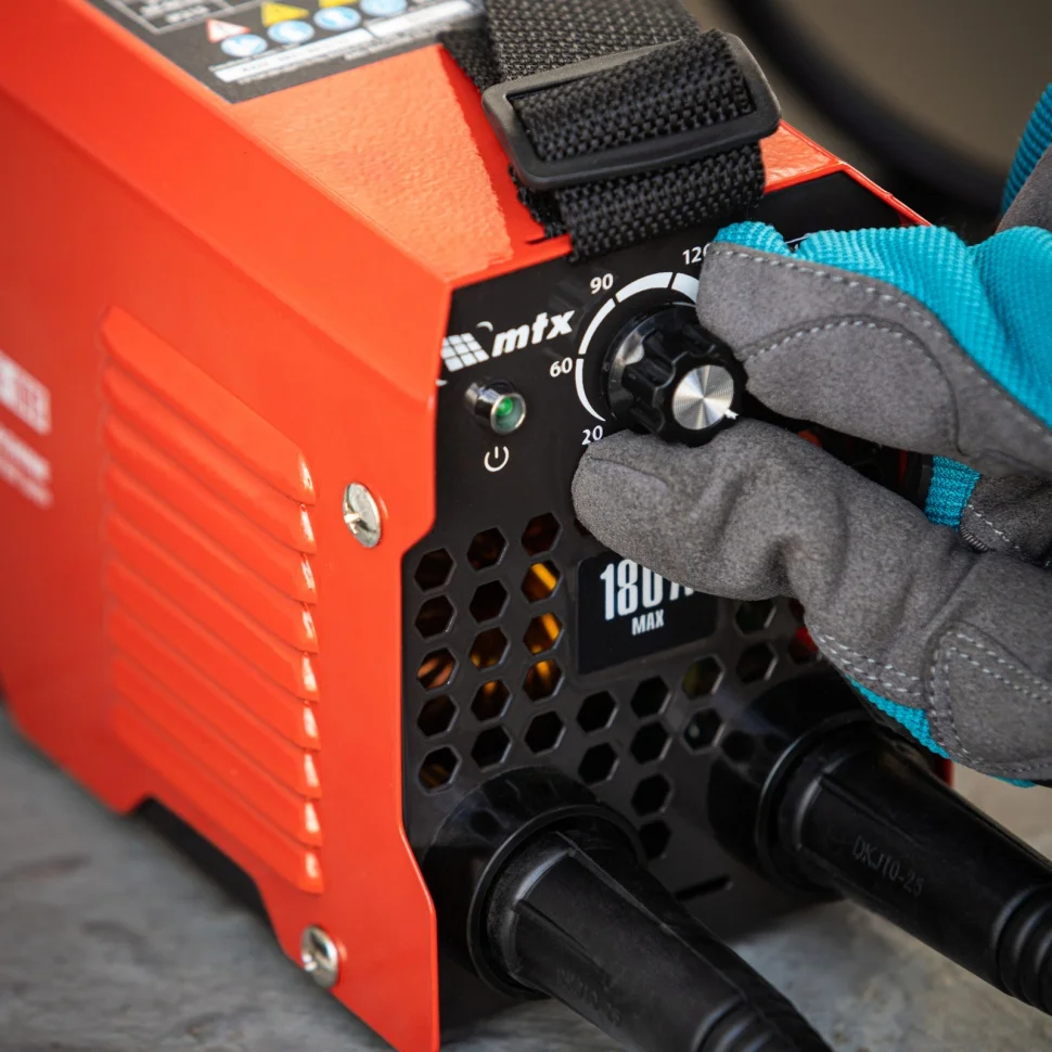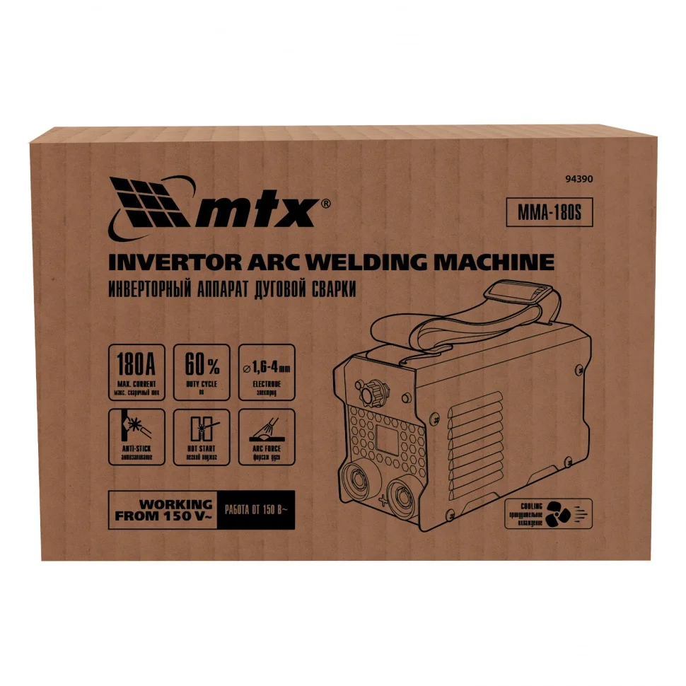 Инверторный аппарат MTX MMA-180S 94390 предназначен для дуговой сварки изделий из низкоуглеродистой стали с помощью штучных электродов диаметром 1,6-4 мм. Сварочный ток плавно регулируется в диапазоне 20-180 А, продолжительность включения (ПВ) на максимальном токе составляет 60%. Аппарат позволяет эффективно выполнять поставленные задачи даже при нестабильном напряжении. Оптимально подходит для использования в частных хозяйствах, будет полезен сотрудникам ЖКХ и работникам аварийно-ремонтных бригад. Отличается низким уровнем шума.ПреимуществаЛегкий поджиг (Hot Start) — даже начинающий мастер сможет быстро зажечь дугу и приступить к сварке.Форсаж дуги (Arc Force) — капля легко отрывается от электрода и переносится на поверхность равномерно, что гарантирует получение аккуратного и ровного сварного шва.Антизалипание электрода (Anti Stick) — снижение сварочного тока позволяет отделить расходник в случае пригорания к металлу без риска повреждения его обмазки.Безопасная работа — встроенная защита отключает аппарат при риске перегрузки и перегрева, позволяя предотвратить его поломку.Компактность, малый вес и ремень для переноски — аппарат удобно брать на выездные работы, он не занимает много места в зоне хранения.Степень защиты IP21S — прямое попадание воды внутрь аппарата исключено.Все необходимое в комплекте — кабель с электрододержателем и кабель с зажимом «земля» прилагаются к инверторному аппарату.
