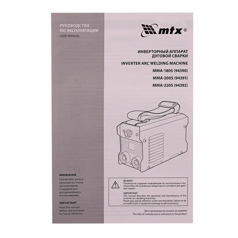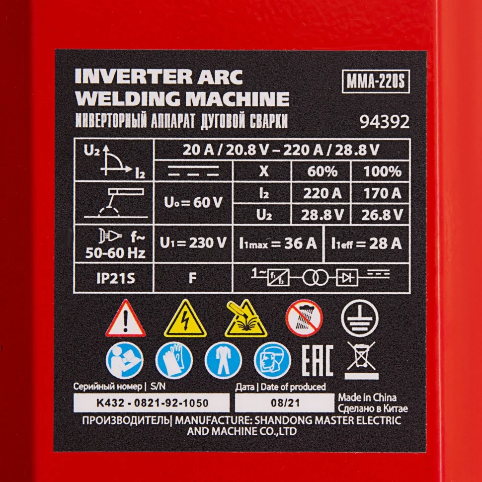 Инверторный аппарат дуговой сварки MMA-220S, 220 А, ПВ60%, диаметр электрода 1,6-5 мм MTX 94392