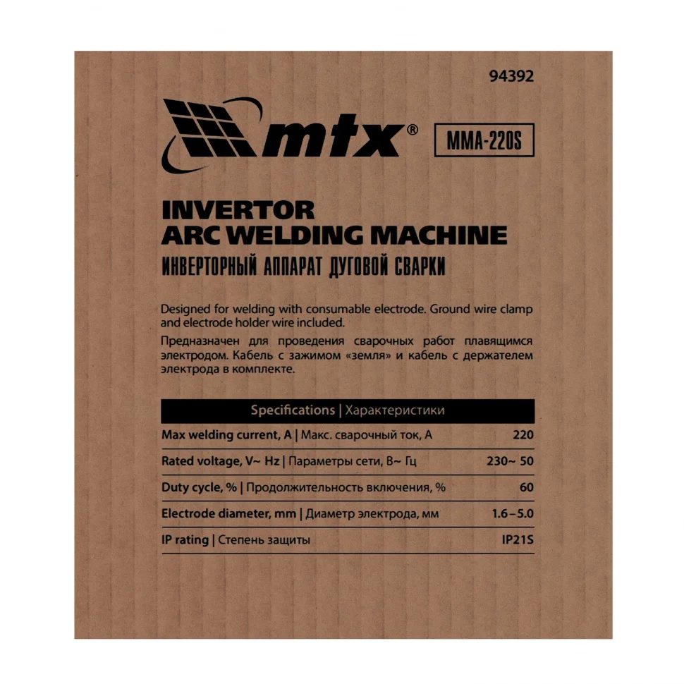 Инверторный аппарат MTX MMA-220S 94392 предназначен для дуговой сварки изделий из низкоуглеродистой стали с помощью штучных электродов диаметром 1,6-5 мм. Сварочный ток плавно регулируется в диапазоне 20-220 А, продолжительность включения (ПВ) на максимальном токе составляет 60%. Аппарат позволяет эффективно выполнять поставленные задачи даже при нестабильном напряжении. Оптимально подходит для использования в частных хозяйствах, будет полезен сотрудникам ЖКХ и работникам аварийно-ремонтных бригад. Отличается низким уровнем шума.