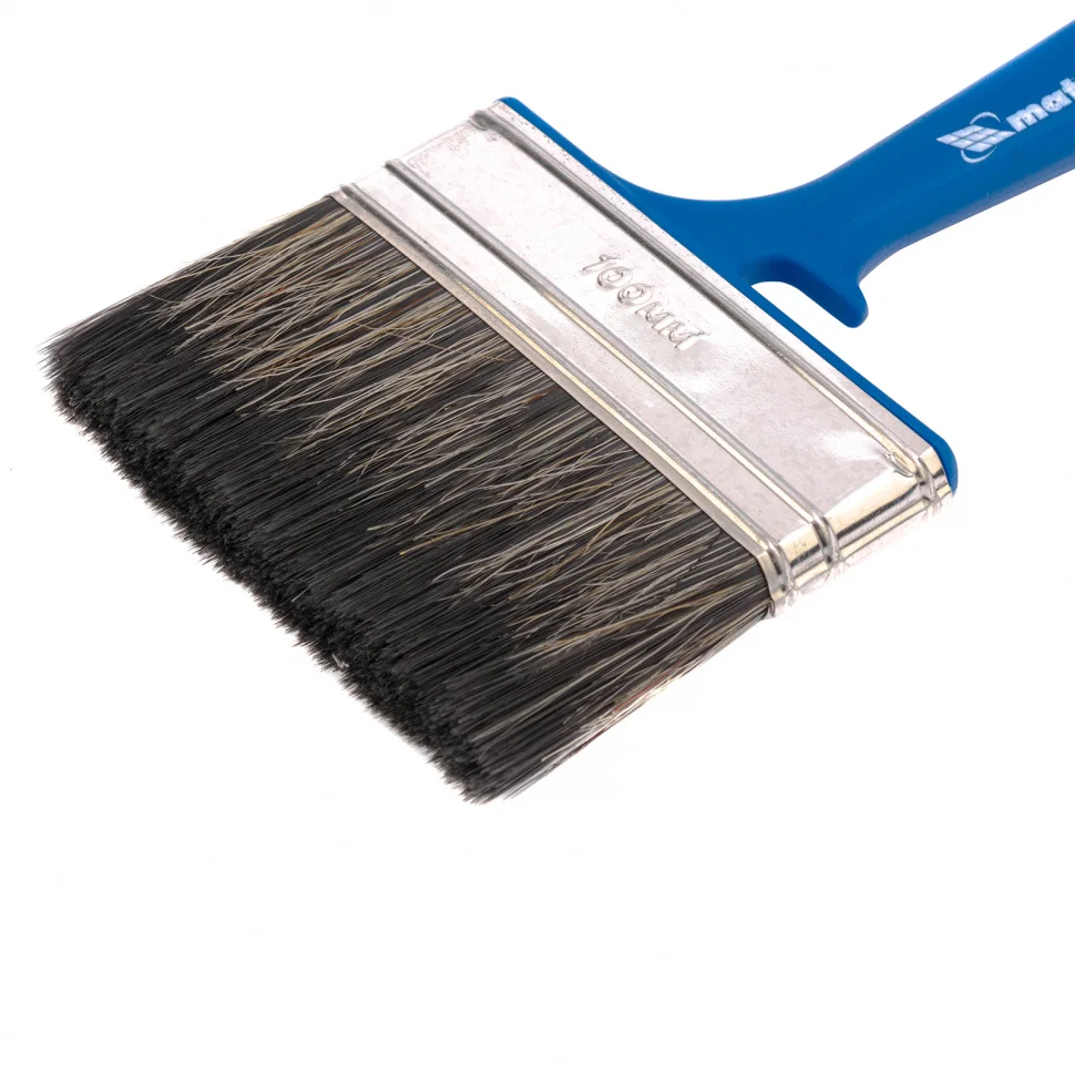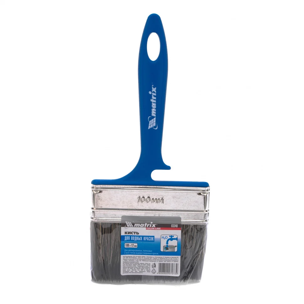 Флейцевая кисть Matrix Color Line «ВОДНЫЕ КРАСКИ» 83348 шириной 100 мм и толщиной 12 мм разработана специально для использования с составами на водной основе, в том числе деревообрабатывающими. Комбинированная щетина оптимальна для работы с водными лакокрасочными материалами — искусственные волокна препятствуют деформации, а натуральные удерживают большой объем краски. Кисть подходит для работы на небольших участках или в труднодоступных местах.ПреимуществаЩетина обладает высокой износоустойчивостью, что продлевает срок службы инструмента.Кончики щетинок расщеплены, что повышает краскообменные свойства и обеспечивает высокое качество работ.Клинья из пластика не деформируются при контакте с ЛКМ, мытье и замачивании кисти.Бандаж с антикоррозионным покрытием не ржавеет, поэтому кисть можно надолго замачивать в воде.Удобная пластиковая ручка комфортна при длительной работе.Кисть удобно хранить — специальная форма рукоятки позволяет закрепить кисть на краю банки или ведра, а отверстие в верхней части служит для подвешивания.