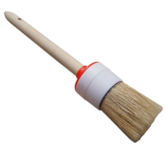 Ворс кисти из натуральной светлой щетины, расщепленной на концах. Диаметр кисти 50 мм. Щетина кисти надежно закреплена пластмассовым бандажом. Ручка изготовлена из дерева. Кисть предназначена для работ с масляными красками и лаками, устойчива к агрессивным составам. Применяется для окраски и грунтовки небольших по площади поверхностей.