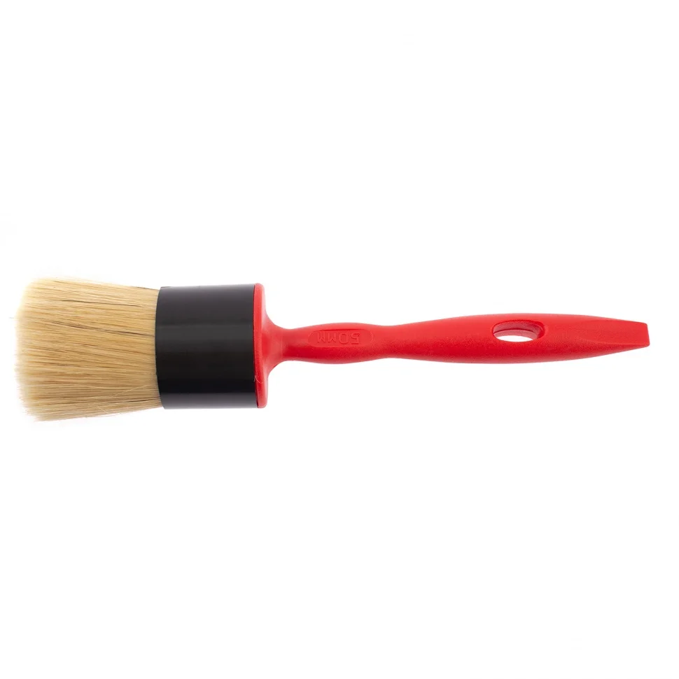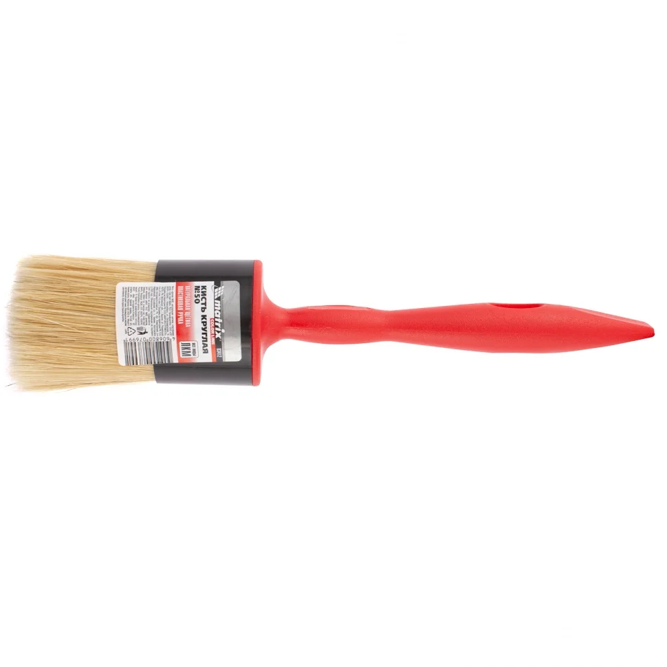 Круглая кисть Matrix Color Line №50 83412 с натуральной щетиной и пластиковой ручкой применяется для окрашивания длинных узких поверхностей любыми видами лакокрасочных материалов. За счет плотной набивки пучка кисть хорошо впитывает и отдает краску. Удлиненная ручка упрощает работу в малодоступных местах.ПреимуществаНатуральная светлая щетина с небольшим добавлением искусственной сохраняет упругость и не деформируется при использовании с любыми ЛКМ.Щетина обладает эффектом «памяти» — быстро возвращает форму даже при интенсивной работе кистью.У щетинок расщеплены кончики, поэтому кисть удерживает и равномерно распределяет большой объем краски.Бандаж изготовлен из полипропилена, а значит, не подвержен разрушению при длительном контакте с ЛКМ или водой.Пластиковые клинья не допускают деформации кисти при замачивании в воде, это позволяет продлить срок ее службы.Щетина проклеена тщательно подобранным эпоксидным клеем, удерживается с помощью клиньев и бандажа, поэтому кисть обладает повышенным качеством и выдерживает интенсивные нагрузки.Рукоятка имеет эргономичную форму, препятствующую появлению усталости при долгой работе.Отверстие на рукоятке позволяет подвешивать кисть для просушки или хранения.