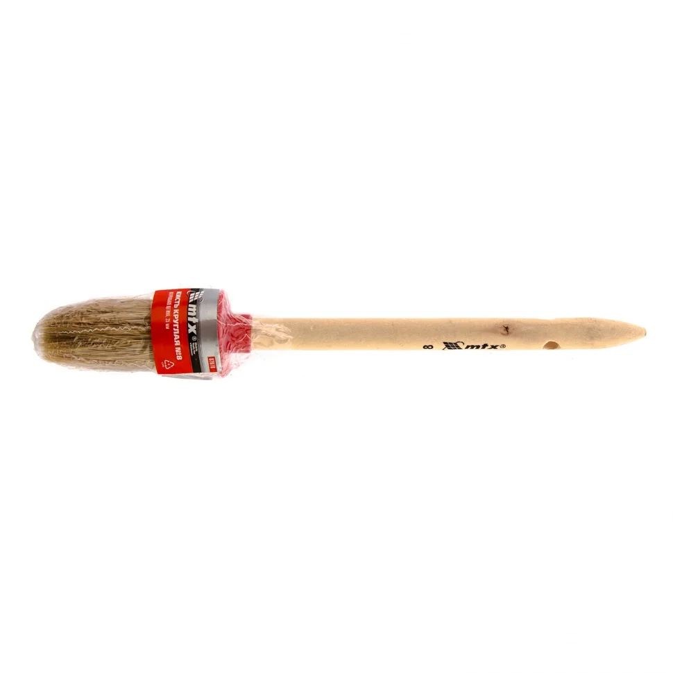 Круглая кисть MTX №8 (35 мм) 82078 с натуральной щетиной и деревянной ручкой пригодится в быту для окрашивания узких длинных поверхностей. Светлая натуральная свиная щетина с добавлением искусственной обладает высокой износоустойчивостью и может использоваться для нанесения красок с содержанием растворителей, а также масляных красок и лаков.ПреимуществаЩетина двойной выварки обеспечивает высокое качество работы, т.к. не содержит включений жира и мелких частиц грязи.Расщепленная на концах щетина увеличивает способность кисти впитывать и отдавать ЛКМ, таким образом повышается эффективность работы.Пластиковый бандаж обеспечивает надежную фиксацию щетины и не подвержен коррозии.Рукоятка из отборной древесины прошла шлифовку и имеет защитное лаковое покрытие, поэтому с ней комфортно работать.На рукоятке предусмотрено отверстие для подвешивания, что обеспечивает удобство хранения.