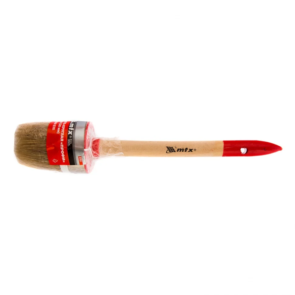 Круглая кисть MTX Профи №14 82051, 50 мм, с натуральной щетиной и деревянной ручкой, используется при проведении профессиональных малярных работ. Рабочая часть изготовлена из натуральной свиной щетины с небольшим добавлением искусственной, это придает ей износостойкость и устойчивость к агрессивным масляным краскам и ЛКМ на основе растворителей. Круглая кисть оптимально подходит для окрашивания узких и труднодоступных участков.ПреимуществаЩетина двойной выварки не содержит включений жира и мелких частиц грязи, это повышает качество работы.Щетина расщеплена на концах, таким образом достигается высокая впитывающая способность и отдача ЛКМ.Металлический бандаж с антикоррозийным покрытием не ржавеет при контакте с водой, поэтому кисть можно мыть.Кисть с щетиной разной длины повышает точность работы.Рукоятка из отборной древесины отшлифована и покрыта лаком для удобства работы и увеличения срока службы кисти.Отверстие на рукоятке позволяет подвешивать кисть для практичного хранения.