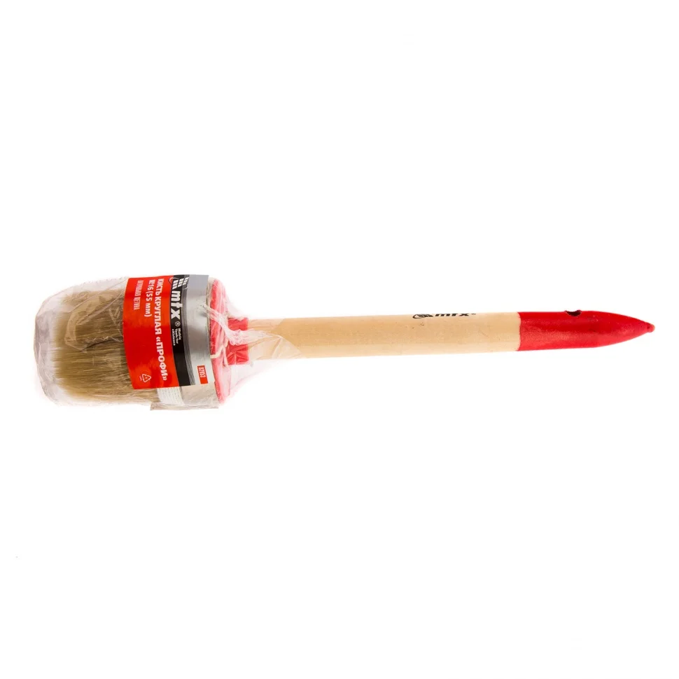 Круглая кисть MTX Профи №16 82053, 55 мм, с натуральной щетиной и деревянной ручкой, используется при проведении профессиональных малярных работ. Рабочая часть изготовлена из натуральной свиной щетины с небольшим добавлением искусственной, это придает ей износостойкость и устойчивость к агрессивным масляным краскам и ЛКМ на основе растворителей. Круглая кисть оптимально подходит для окрашивания узких и труднодоступных участков.ПреимуществаЩетина двойной выварки не содержит включений жира и мелких частиц грязи, это повышает качество работы.Щетина расщеплена на концах, таким образом достигается высокая впитывающая способность и отдача ЛКМ.Металлический бандаж с антикоррозийным покрытием не ржавеет при контакте с водой, поэтому кисть можно мыть.Кисть с щетиной разной длины повышает точность работы.Рукоятка из отборной древесины отшлифована и покрыта лаком для удобства работы и увеличения срока службы кисти.Отверстие на рукоятке позволяет подвешивать кисть для практичного хранения.
