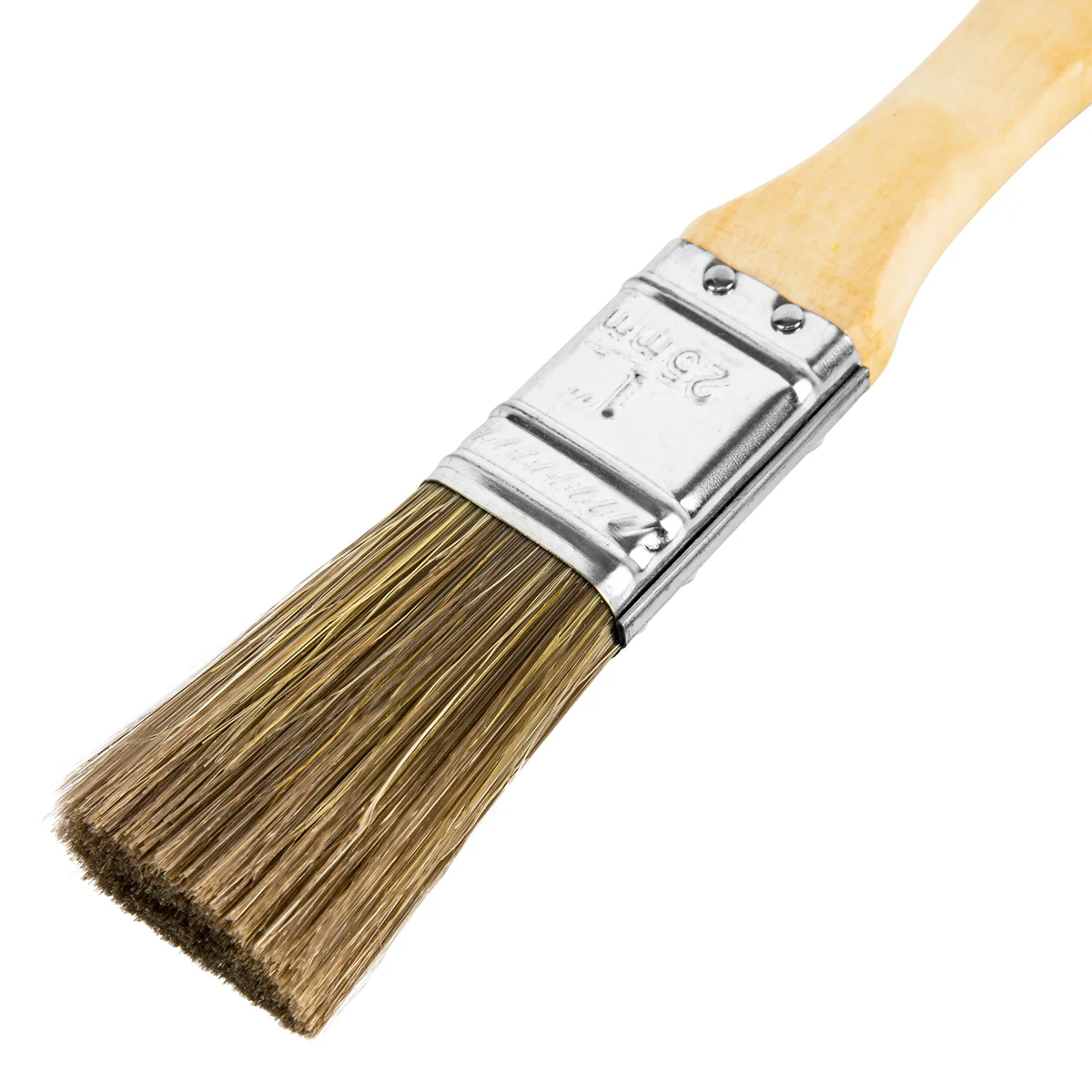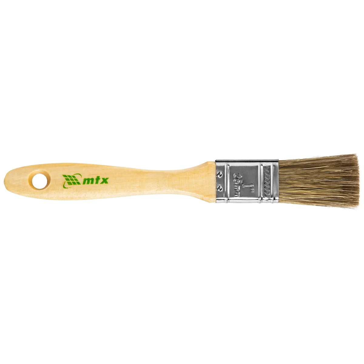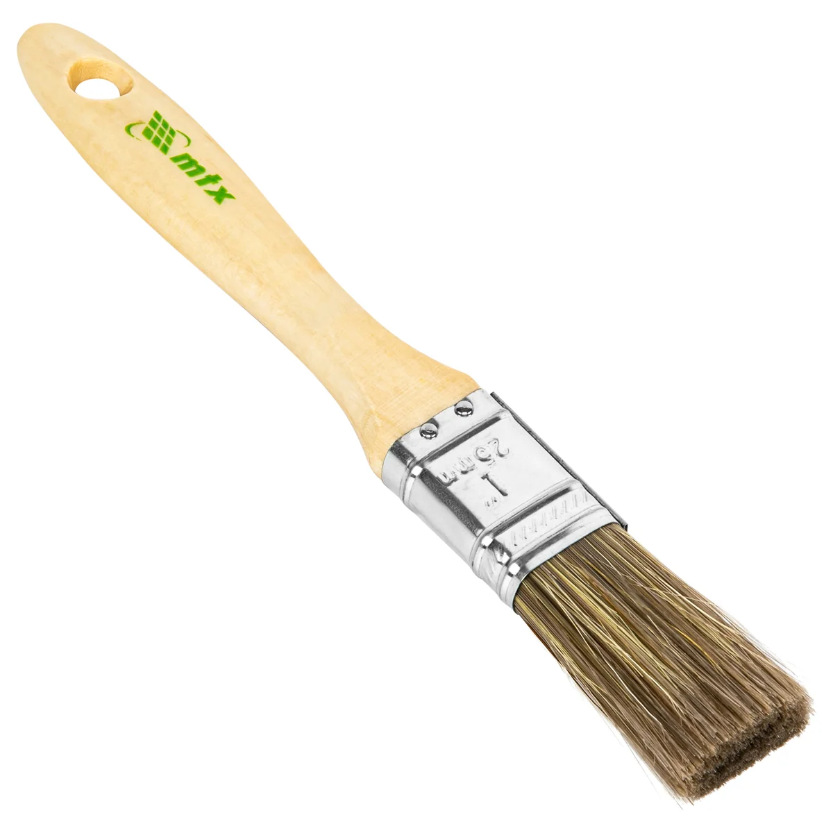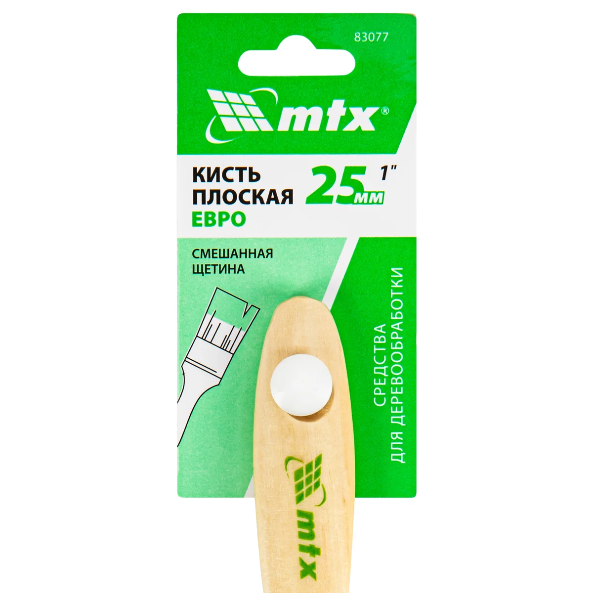 Плоская кисть MTX «Евро» 83077 шириной 1 , с деревянной ручкой, имеет смешанную щетину и оптимальна для нанесения средств защиты древесины (пропитки, грунтовки, антисептиков, морилки). Сочетает все преимущества искусственной и натуральной щетины благодаря оптимальной комбинации натуральных и искусственных волокон. Обладает высокими краскообменными качествами: благодаря натуральной щетине в составе кисть хорошо впитывает и отдает краску. Инструмент подходит для профессионального использования.ПреимуществаВысокий ресурс — искусственный ворс не разбухает и не деформируется под воздействием воды, а натуральная щетина обеспечивает хорошую отдачу краски и устойчивость к любым типам ЛКМ.Защита от разрушения — на металлический бандаж нанесено антикоррозийное, а на деревянную рукоятку — матовое лаковое покрытие.Комфортная эксплуатация — деревянная рукоятка не скользит в руке во время работы.Эргономичность — рукоятка удобно ложится в руку, обеспечивая комфорт во время длительной работы.Ширина 25 мм — кисть удобна для обработки небольших участков и труднодоступных мест.Продуманное хранение — в рукоятке предусмотрено отверстие для подвешивания кисти на крючок или гвоздь.