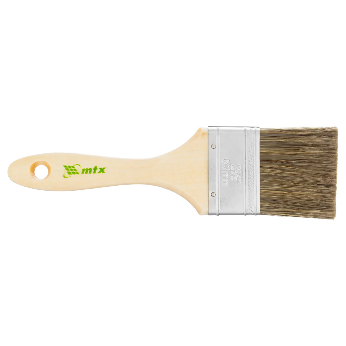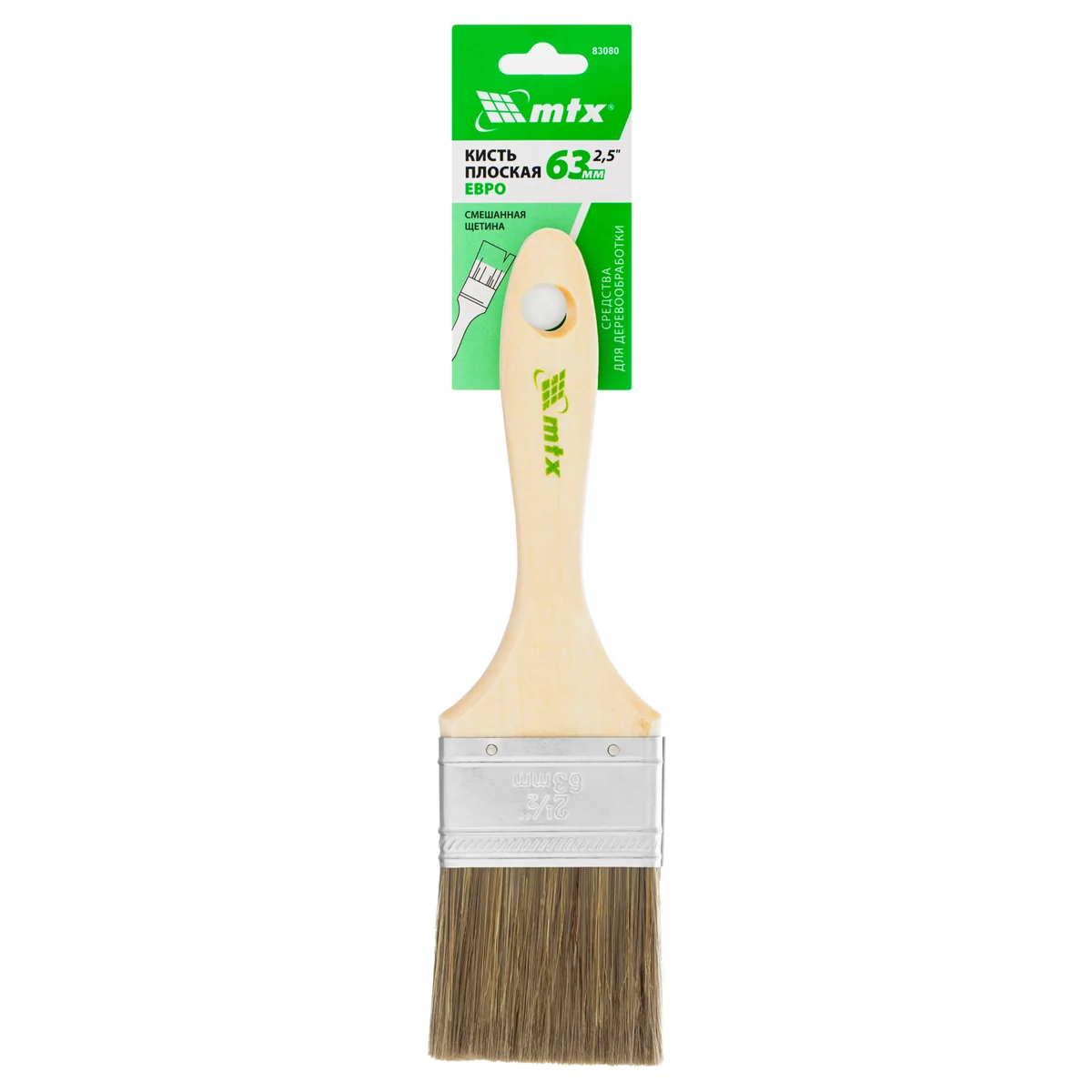 Плоская кисть MTX «Евро» 83080 шириной 2,5 , с деревянной ручкой, имеет смешанную щетину и оптимальна для нанесения средств защиты древесины (пропитки, грунтовки, антисептиков, морилки). Сочетает все преимущества искусственной и натуральной щетины благодаря оптимальной комбинации натуральных и искусственных волокон. Обладает высокими краскообменными качествами: благодаря натуральной щетине в составе кисть хорошо впитывает и отдает краску. Инструмент подходит для профессионального использования.ПреимуществаВысокий ресурс — искусственный ворс не разбухает и не деформируется под воздействием воды, а натуральная щетина обеспечивает хорошую отдачу краски и устойчивость к любым типам ЛКМ.Защита от разрушения — на металлический бандаж нанесено антикоррозийное, а на деревянную рукоятку — матовое лаковое покрытие.Комфортная эксплуатация — деревянная рукоятка не скользит в руке во время работы.Эргономичность — рукоятка удобно ложится в руку, обеспечивая комфорт во время длительной работы.Ширина 63 мм — кисть удобна для обработки участков небольшой площади.Продуманное хранение — в рукоятке предусмотрено отверстие для подвешивания кисти на крючок или гвоздь.
