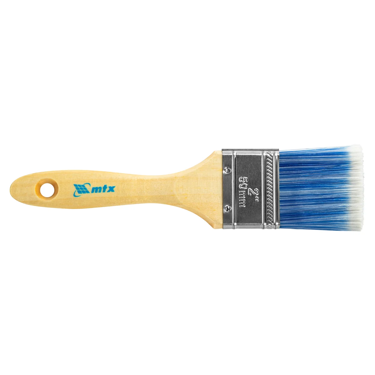 Плоская кисть MTX «Евро» 83071 шириной 2 , с искусственной щетиной и деревянной ручкой, предназначена для малярных работ. Оптимальна для работы с водорастворимыми ЛКМ (акриловыми, латексными, водоэмульсионными), удобна для обработки узких и труднодоступных мест. Кисть подходит для профессионального использования.ПреимуществаДолговечность — искусственная щетина не разбухает и не теряет эластичность под действием воды, выдерживает многократное использование.Прочность — щетина крепко зафиксирована при помощи клеевого состава и металлического бандажа.Эффективная работа — расщепленная на концах щетина хорошо впитывает и отдает краску.Высокое качество выполняемых работ — благодаря волоскам конической формы кисть равномерно распределяет краску, позволяя получить гладкое покрытие.Коррозионная стойкость — на металлический бандаж нанесено защитное покрытие, а на деревянную рукоятку — матовый лаковый состав.Комфортная работа — эргономичная рукоятка удобно ложится в руку, позволяя долго работать без ощущения усталости.Удобное хранение — в рукоятке имеется отверстие для подвешивания кисти на крючок или гвоздь.