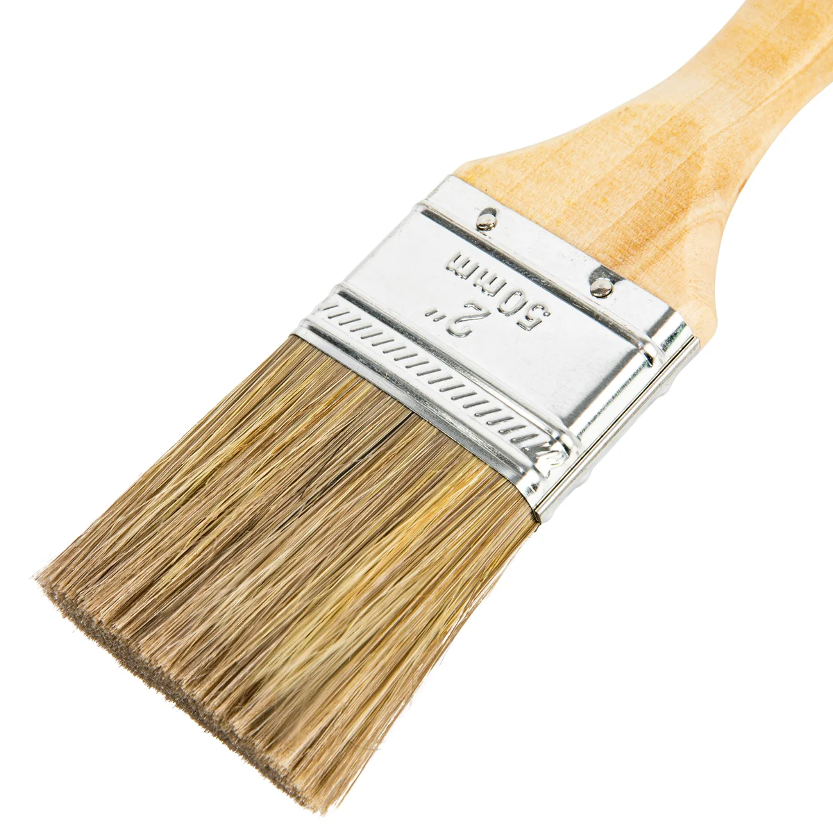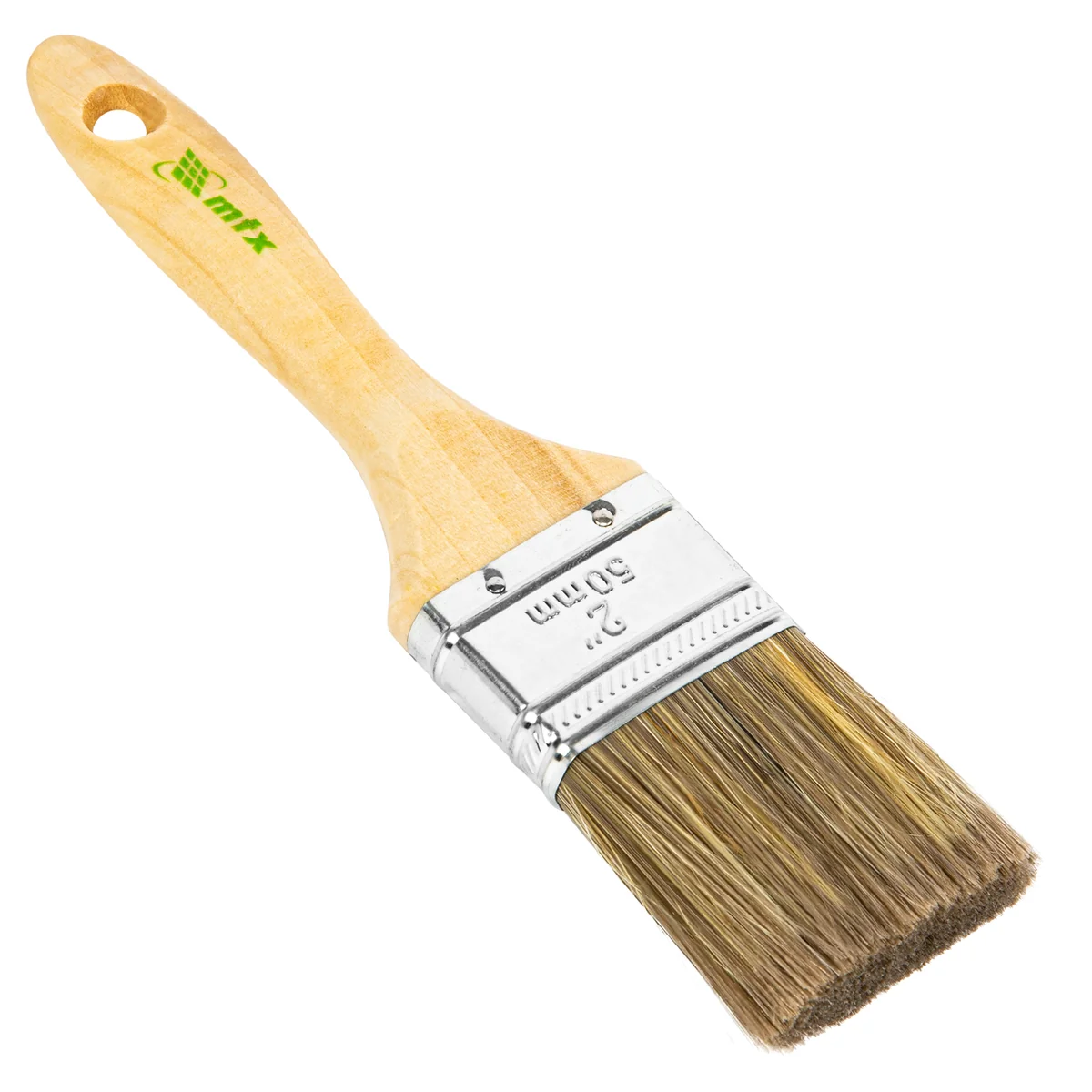 Плоская кисть MTX «Евро» 83079 шириной 2 , с деревянной ручкой, имеет смешанную щетину и оптимальна для нанесения средств защиты древесины (пропитки, грунтовки, антисептиков, морилки). Сочетает все преимущества искусственной и натуральной щетины благодаря оптимальной комбинации натуральных и искусственных волокон. Обладает высокими краскообменными качествами: благодаря натуральной щетине в составе кисть хорошо впитывает и отдает краску. Инструмент подходит для профессионального использования.ПреимуществаВысокий ресурс — искусственный ворс не разбухает и не деформируется под воздействием воды, а натуральная щетина обеспечивает хорошую отдачу краски и устойчивость к любым типам ЛКМ.Защита от разрушения — на металлический бандаж нанесено антикоррозийное, а на деревянную рукоятку — матовое лаковое покрытие.Комфортная эксплуатация — деревянная рукоятка не скользит в руке во время работы.Эргономичность — рукоятка удобно ложится в руку, обеспечивая комфорт во время длительной работы.Ширина 50 мм — кисть удобна для обработки небольших участков и труднодоступных мест.Продуманное хранение — в рукоятке предусмотрено отверстие для подвешивания кисти на крючок или гвоздь.