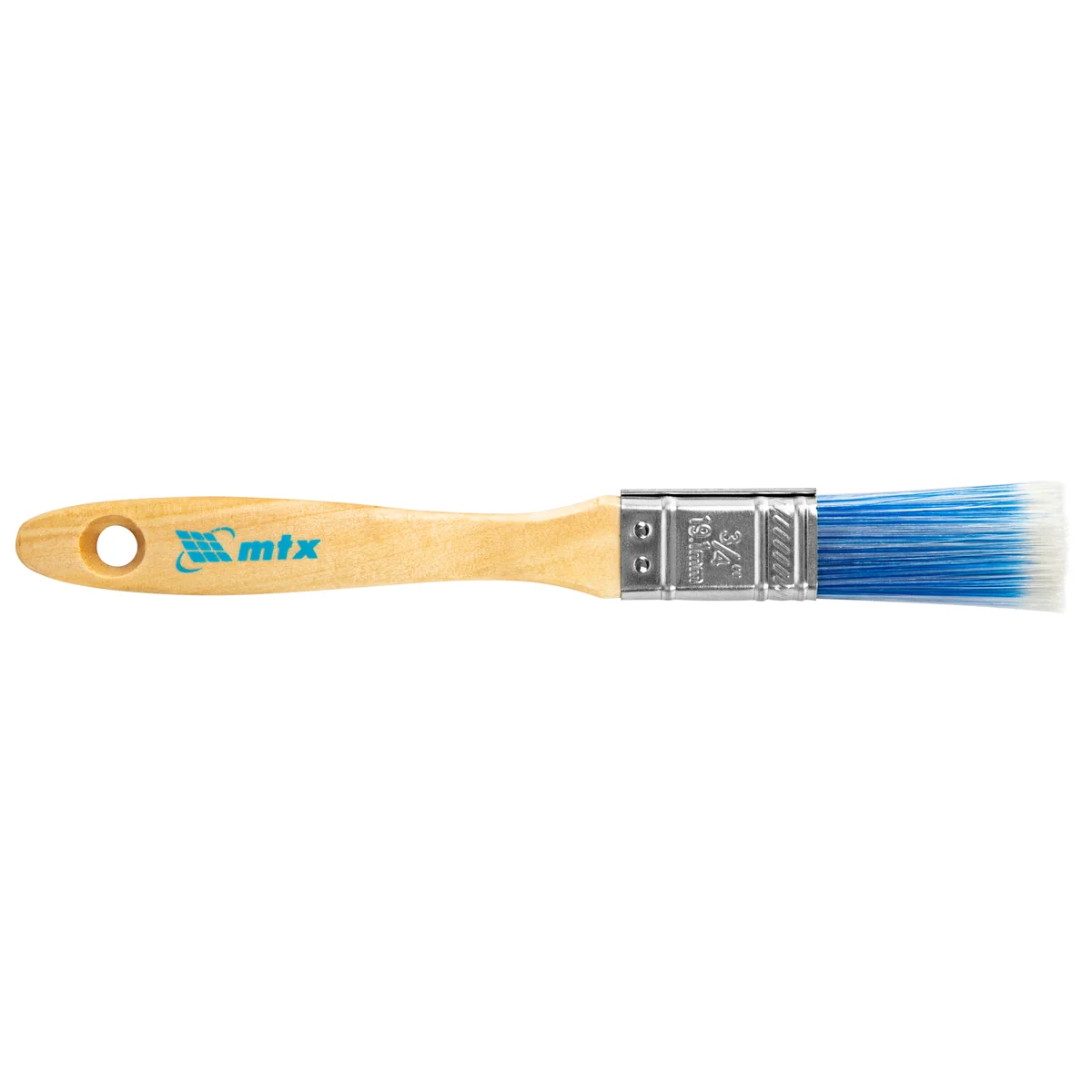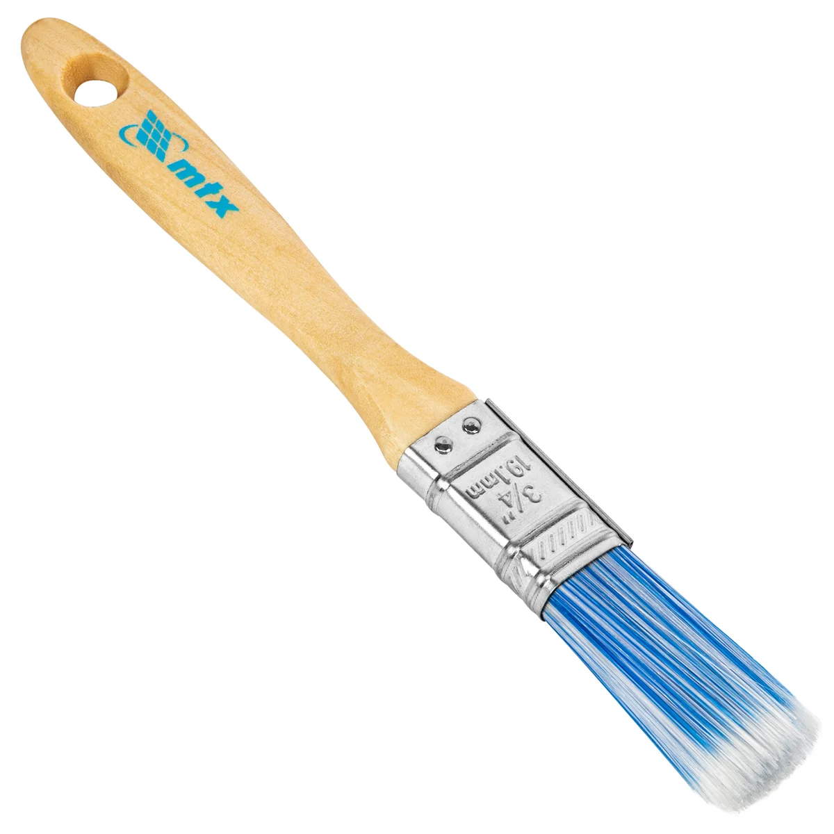 Плоская кисть MTX «Евро» 83068 шириной 3/4 , с искусственной щетиной и деревянной ручкой, предназначена для малярных работ. Оптимальна для работы с водорастворимыми ЛКМ (акриловыми, латексными, водоэмульсионными), удобна для обработки узких и труднодоступных мест. Кисть подходит для профессионального использования.ПреимуществаДолговечность — искусственная щетина не разбухает и не теряет эластичность под действием воды, выдерживает многократное использование.Прочность — щетина крепко зафиксирована при помощи клеевого состава и металлического бандажа.Эффективная работа — расщепленная на концах щетина хорошо впитывает и отдает краску.Высокое качество выполняемых работ — благодаря волоскам конической формы кисть равномерно распределяет краску, позволяя получить гладкое покрытие.Коррозионная стойкость — на металлический бандаж нанесено защитное покрытие, а на деревянную рукоятку — матовый лаковый состав.Комфортная работа — эргономичная рукоятка удобно ложится в руку, позволяя долго работать без ощущения усталости.Удобное хранение — в рукоятке имеется отверстие для подвешивания кисти на крючок или гвоздь.