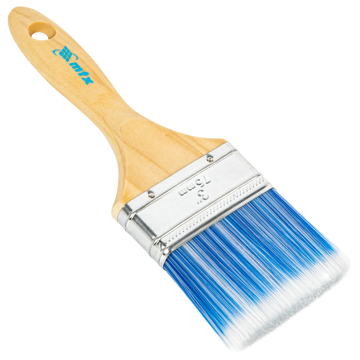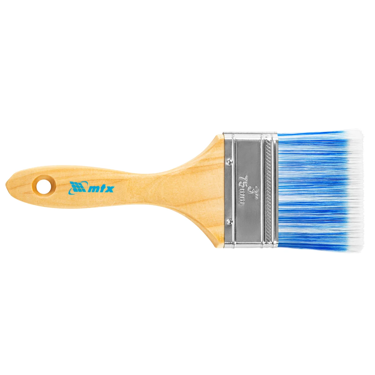 Плоская кисть MTX «Евро» 83073 шириной 3 , с искусственной щетиной и деревянной ручкой, предназначена для малярных работ. Оптимальна для работы с водорастворимыми ЛКМ (акриловыми, латексными, водоэмульсионными), удобна для обработки участков небольшой площади. Кисть подходит для профессионального использования.ПреимуществаДолговечность — искусственная щетина не разбухает и не теряет эластичность под действием воды, выдерживает многократное использование.Прочность — щетина крепко зафиксирована при помощи клеевого состава и металлического бандажа.Эффективная работа — расщепленная на концах щетина хорошо впитывает и отдает краску.Высокое качество выполняемых работ — благодаря волоскам конической формы кисть равномерно распределяет краску, позволяя получить гладкое покрытие.Коррозионная стойкость — на металлический бандаж нанесено защитное покрытие, а на деревянную рукоятку — матовый лаковый состав.Комфортная работа — эргономичная рукоятка удобно ложится в руку, позволяя долго работать без ощущения усталости.Удобное хранение — в рукоятке имеется отверстие для подвешивания кисти на крючок или гвоздь.