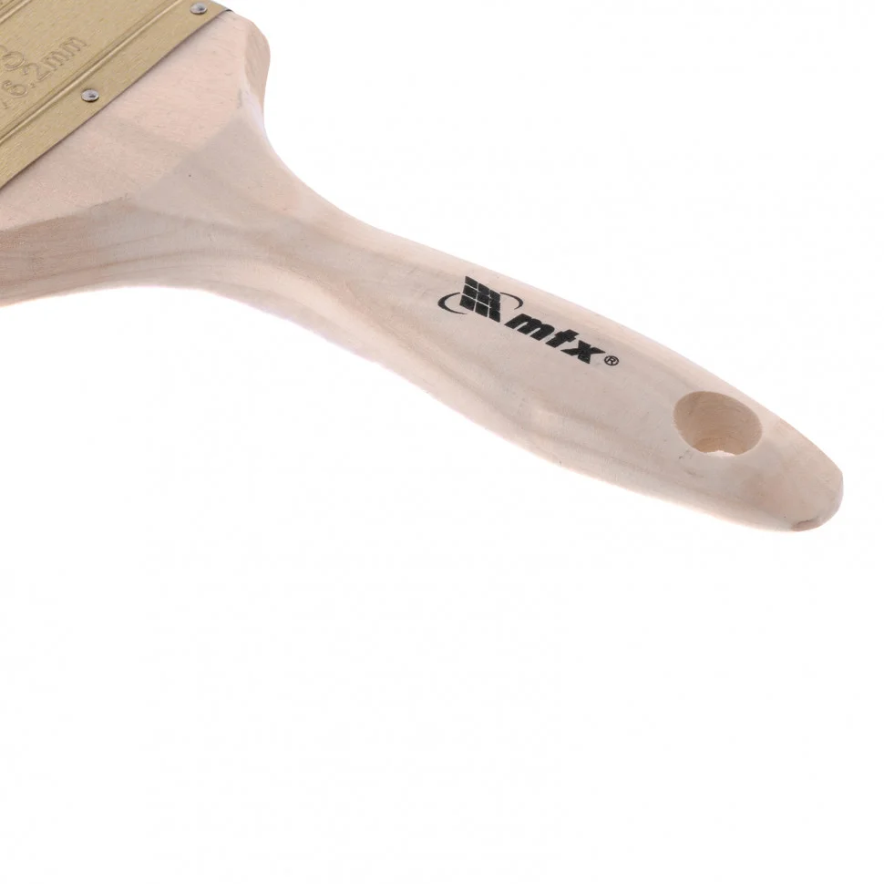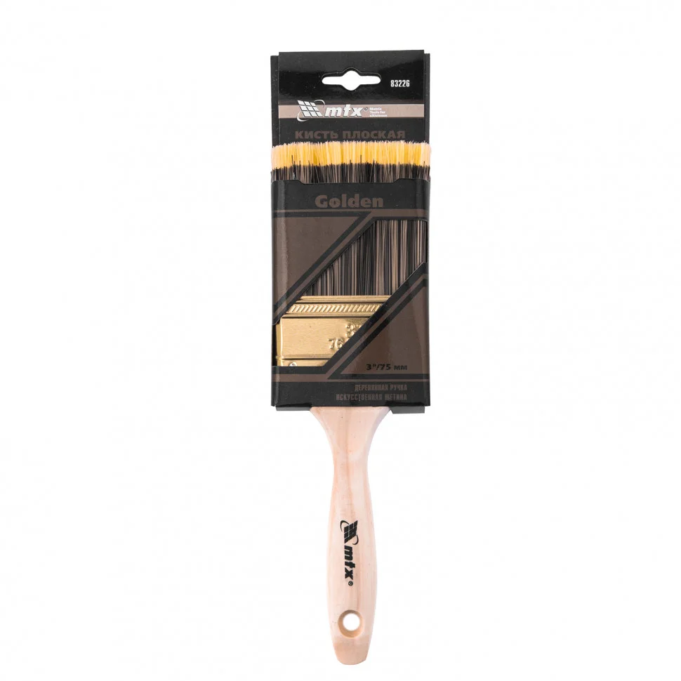 Плоская кисть MTX Golden 83226 шириной 3 дюйма, с искусственной щетиной и деревянной ручкой, используется при проведении малярных работ. Она подходит для нанесения красок на водной основе, т.к. синтетическое волокно не теряет своей формы при работе с ними. Кисть с жесткой, полой внутри щетиной эффективно окрашивает грубые и неровные поверхности, а также отлично впитывает и отдает краску. Ширина кисти составляет 75 мм, такой размер позволяет быстро окрашивать большие площади.ПреимуществаЩетина надежно закреплена с помощью клеевого состава, клиньев и металлического бандажа.Металлический бандаж устойчив к образованию ржавчины благодаря антикоррозийному покрытию.Искусственная щетина обладает повышенной износостойкостью и не теряет упругость при взаимодействии с водорастворимыми лакокрасочными материалами.Рукоятка изготовлена из дорогой древесины твердых пород, поэтому не имеет дефектов, не требует покрытия лаком и обеспечивает надежный хват.Отверстие на рукоятке предназначено для подвешивания кисти, поэтому ее удобно хранить.