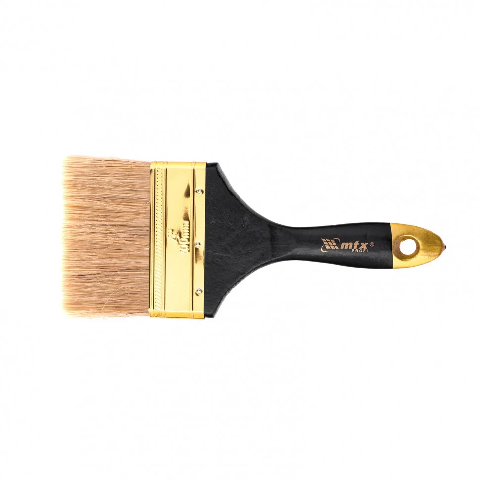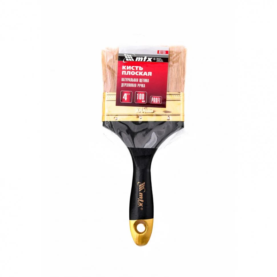 Плоская кисть «Профи» MTX 83155, 4 дюйма, с натуральной щетиной и деревянной ручкой, рассчитана на профессиональное использование при проведении малярных работ. Натуральная щетина с увеличенной плотностью набивки универсальна по своему применению и подходит для нанесения различных типов ЛКМ, в том числе с содержанием растворителей. Кисть шириной 100 мм применяется при необходимости окрашивания больших поверхностей.ПреимуществаКисть премиум качества легко выдерживает интенсивное и многократное использование.Щетина прошла двойную выварку, такая технология изготовления исключает попадание посторонних примесей на окрашиваемую поверхность.Высокий ресурс кисти обеспечивает бандаж, который предотвращает выпадение щетины.Антикоррозийное покрытие на бандаже не допускает образования ржавчины, поэтому кисть можно мыть и чистить.С помощью расщепленной на концах кисти можно создать ровное и качественное покрытие, т.к. она отличается высокими показателями впитываемости и отдачи краски.Рукоятка кисти выполнена из отборной древесины, которая шлифуется и покрывается лаком для комфортного использования.Кисть оснащена отверстием для подвешивания, что обеспечивает возможность практичного хранения.