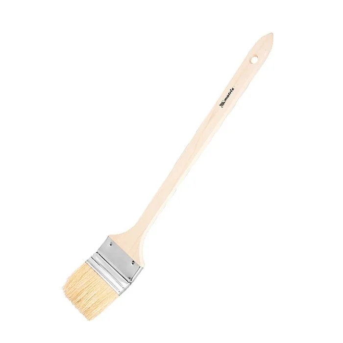 Ворс кисти из натуральной щетины двойной выварки. Щетина расщеплена на концах. Толщина кисти от 6 до 10 мм. Щетина кисти надежно закреплена металлическим бандажом с антикоррозийным покрытием. Деревянная ручка имеет удлиненную форму, не скользит в руке. Кисть применяется для выполнения малярных работ в труднодоступных местах (отопительные радиаторы, трубы, поверхности за радиаторами). Предназначена для работ с масляными красками и лаками, устойчива к агрессивным составам.