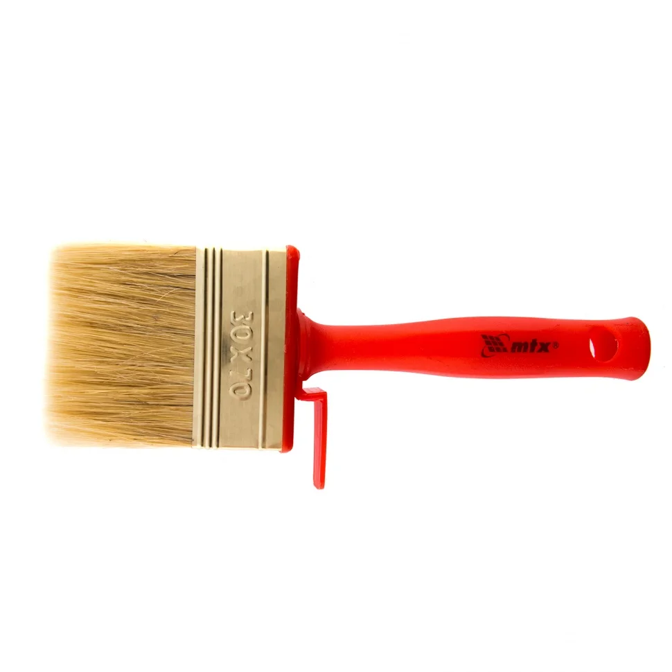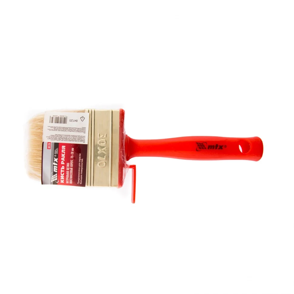 Кисть-ракля MTX 84120, 30 х 70 мм, с натуральной щетиной, пластмассовыми корпусом и ручкой, используется для малярных работ на участках большой площади, поэтому удобна для обработки стен, потолков и фасадов. Натуральная щетина устойчива к химическому воздействию, поэтому не деформируется и сохраняет упругость при работе с ЛКМ на водной основе, грунтовками, масляными красками и клеящими составами.ПреимуществаРасщепленная на концах щетина обладает повышенной способностью набирать, удерживать и распределять по поверхности лакокрасочные материалы.ЛКМ наносится ровно, так как кисть изготовлена с использованием натуральной щетины двойной выварки.Инструмент отвечает всем требованиям проведения малярных работ и прослужит долго — щетина устойчива к износу, а металлический бандаж имеет антикоррозийное покрытие и не ржавеет при контакте с ЛКМ и водой.Утолщенная рукоятка обеспечивает удобный захват и позволяет долго работать без усталости.Во время перерыва да кисть можно закрепить на краю емкости с краской при помощи приспособления на корпусе.Отверстие для подвешивания позволяет сушить и хранить кисть в вертикальном положении.