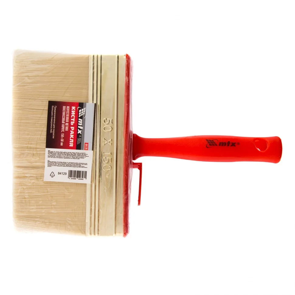 Кисть-ракля MTX 84129, 50 х 150 мм, с искусственной щетиной, пластмассовыми корпусом и ручкой, используется для малярных работ на участках большой площади, поэтому удобна для обработки стен, потолков и фасадов. Подходит для работы с ЛКМ на водной основе, поскольку искусственная щетина не деформируется и сохраняет упругость при контакте с ними.ПреимуществаРасщепленная на концах щетина обладает повышенной способностью набирать, удерживать и распределять по поверхности лакокрасочные материалы.Инструмент отвечает всем требованиям проведения малярных работ и прослужит долго — щетина устойчива к износу, а металлический бандаж имеет антикоррозийное покрытие и не ржавеет при контакте с ЛКМ и водой.Утолщенная рукоятка обеспечивает удобный захват и позволяет долго работать без усталости.Во время перерыва да кисть можно закрепить на краю емкости с краской при помощи приспособления на корпусе.Отверстие для подвешивания позволяет сушить и хранить кисть в вертикальном положении.