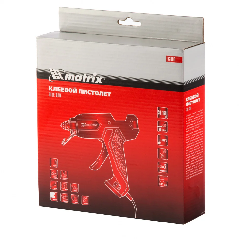 Клеевой пистолет Matrix 93006, 11 мм, с выключателем и индикатором напряжения используется для бытовых и полупрофессиональных нужд: мелкого ремонта, упаковки товаров, фиксации деталей, создания игрушек и объемных украшений, декорирования и т.д. Инструмент пригодится отделочникам, моделистам и тем, кто занимается хенд-мейдом. Он обладает высокой производительностью и выдает 18 г клея в минуту. А для удобства работы предусмотрен индикатор состояния готовности пистолета и выключатель.ПреимуществаНосик оборудован специальной накладкой из каучука, которая защищает оператора от ожогов.Противокапельная система предотвращает подтекание клея, это позволяет снизить его расход и содержать рабочее место в порядке.Пистолет можно ставить на металлическую скобу-подставку для удобства работы.Пистолет полностью готов к работе - в комплекте идут 2 клеевых стержня.