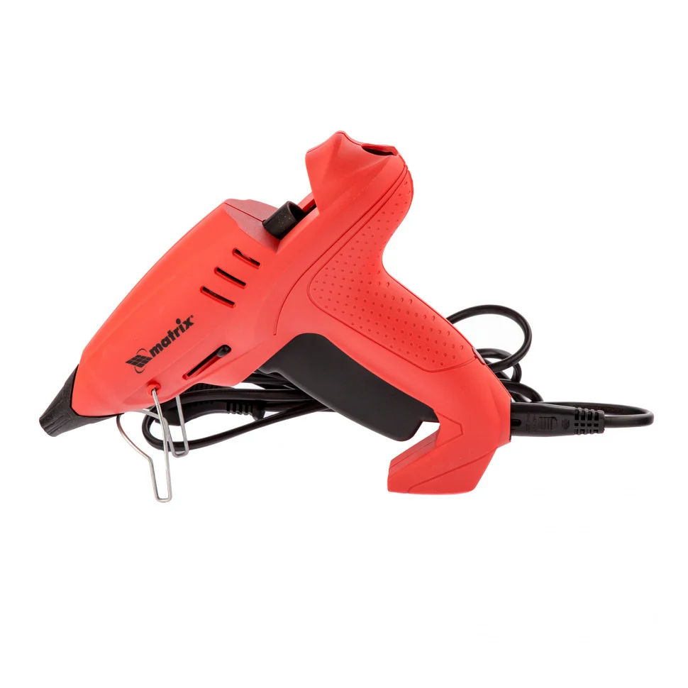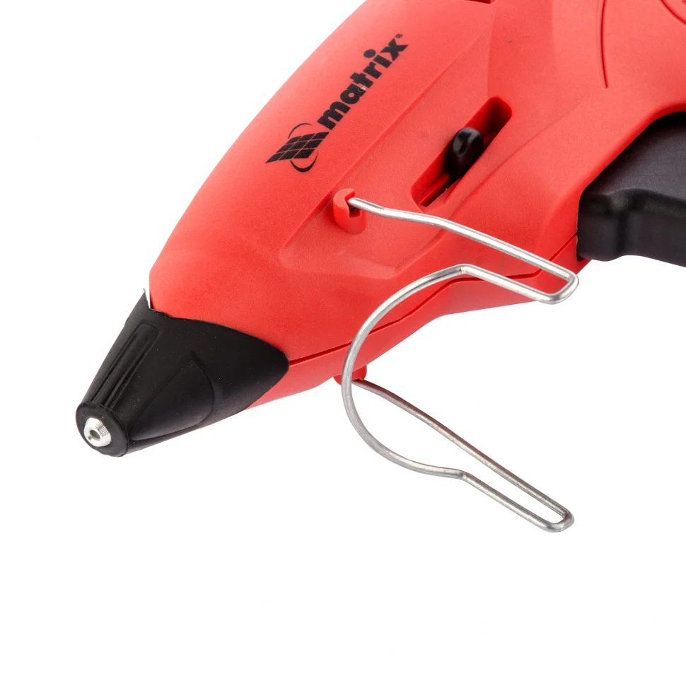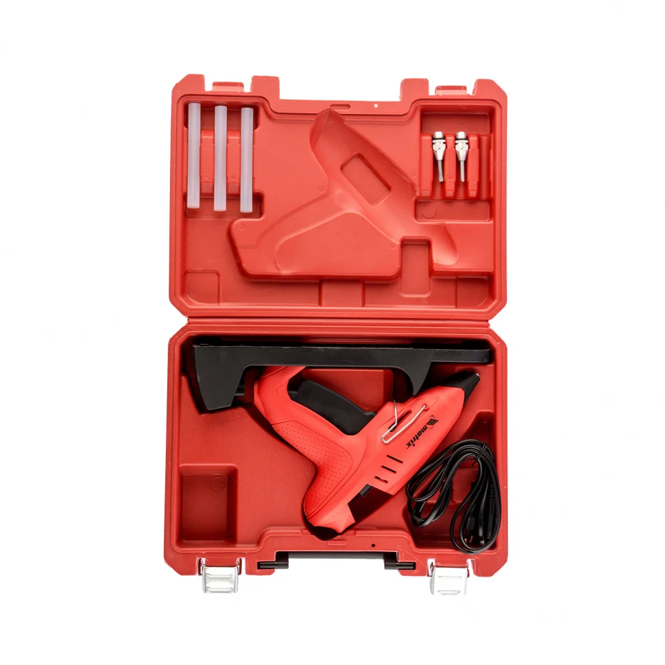 Клеевой пистолет Matrix 93015, 11 мм, с подставкой, кейсом и регулятором используется для бытовых и полупрофессиональных нужд: мелкого ремонта, упаковки товаров, фиксации деталей, создания игрушек и объемных украшений, декорирования и т.д. Инструмент пригодится отделочникам, моделистам и тем, кто занимается хенд-мейдом. Он обладает высокой производительностью и выдает 20 г клея в минуту. А для ускорения или замедления плавления клея предусмотрен регулятор температуры в диапазоне 150-200°C.ПреимуществаНосик оборудован специальной накладкой из каучука, которая защищает оператора от ожогов.Противокапельная система предотвращает подтекание клея, это позволяет снизить его расход и содержать рабочее место в порядке.Пистолет можно ставить на подставку с емкостью для стекающего клея для удобства работы.Съемный кабель обеспечивает автономность работы - нагретый пистолет можно использовать без подключения к розетке в течение 5 минут.Для удобства хранения и транспортировки предусмотрен кейс в комплекте.Пистолет полностью готов к работе - в комплекте идут 2 запасных сопла и 3 клеевых стержня.