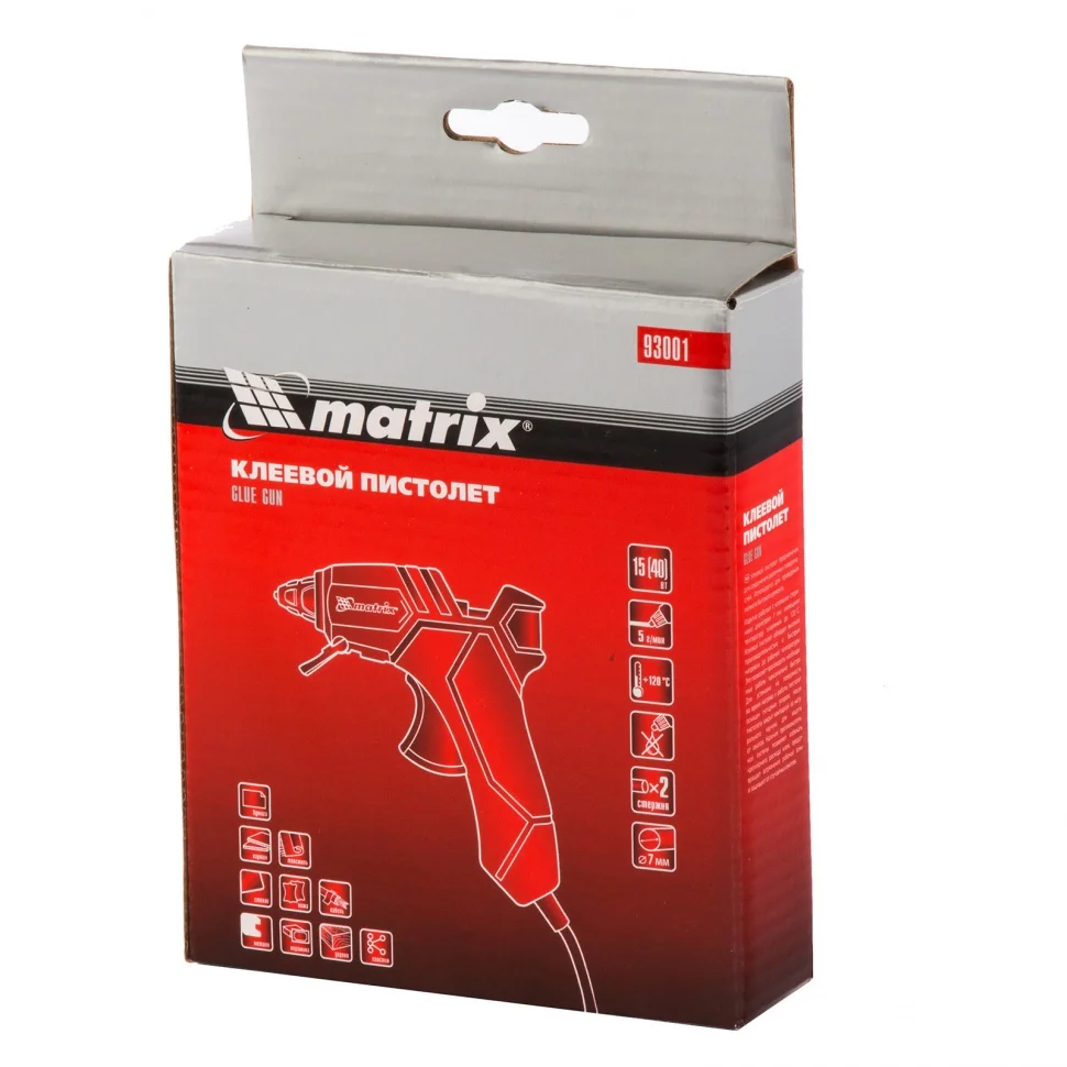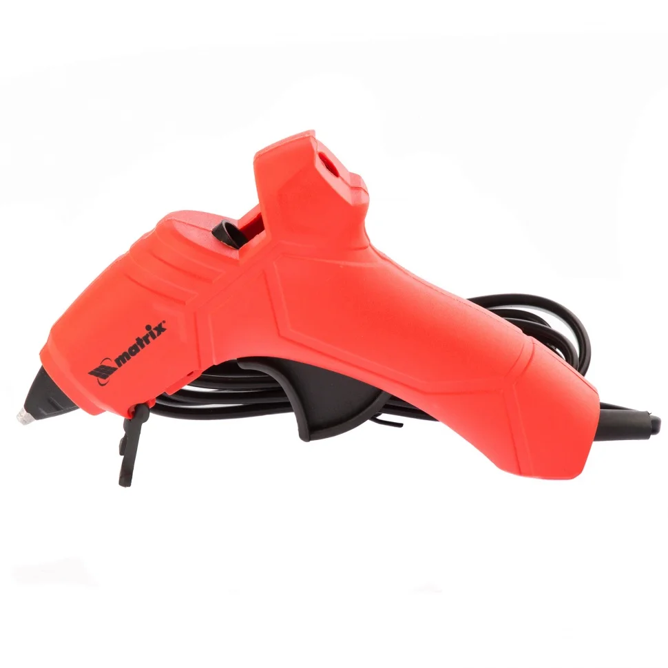 Клеевой пистолет Matrix 93001, 7 мм, используется для бытовых и полупрофессиональных нужд: мелкого ремонта, упаковки товаров, фиксации деталей, создания игрушек и объемных украшений, декорирования и т.д. Инструмент пригодится отделочникам, моделистам и тем, кто занимается хенд-мейдом. Он выдает 5 г клея в минуту.ПреимуществаНосик оборудован специальной накладкой из каучука, которая защищает оператора от ожогов.Противокапельная система предотвращает подтекание клея, это позволяет снизить его расход и содержать рабочее место в порядке.Пистолет можно ставить на подставку для удобства работы.Пистолет полностью готов к работе - в комплекте идут 2 клеевых стержня.