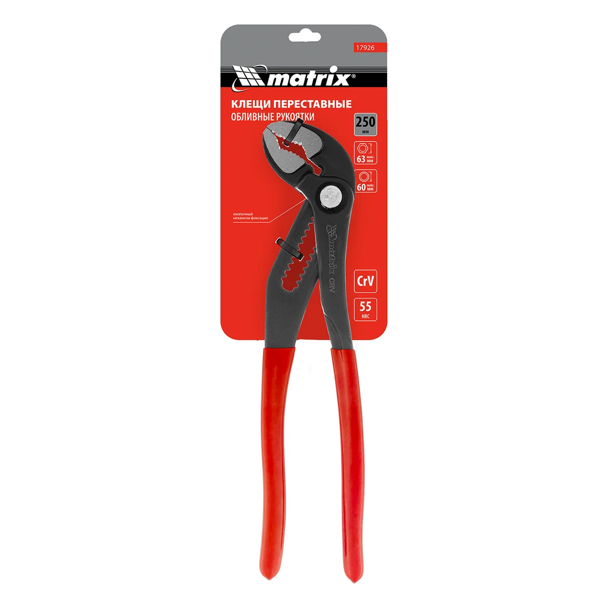 Клещи переставные 250 мм, кнопочный механизм, хром-ванадий, обливные рукоятки Matrix 17926