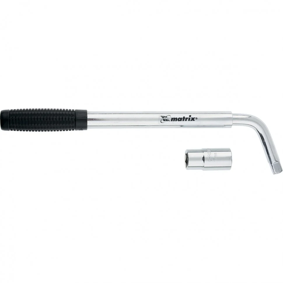 Телескопический Г-образный баллонный ключ Matrix 14237, 1/2 дюйма, 17 х 19 мм, применяется при снятии и установке автомобильных колес. Г-образная форма облегчает работу с крепежами. Двойная съемная торцевая головка рассчитана на болтовые соединения 17 и 19 мм. Ключ предназначен для использования в гараже, на станции шиномонтажа или в автосервисе, а также позволит быстро заменить колесо в дороге.ПреимуществаБаллонный ключ изготовлен из прочной хромованадиевой стали, поэтому устойчив к нагрузкам и обладает высоким рабочим ресурсом.Телескопическая рукоятка раздвигается на длину от 300 до 450 мм, что позволяет регулировать величину крутящего момента при монтаже и демонтаже крепежей.Хромоникелевое покрытие защищает инструмент от повреждений и коррозии.Торцевая головка надежно крепится на ключ при помощи шарикового фиксатора, поэтому не соскочит во время работы.Ключ имеет присоединительный квадрат 1/2 дюйма, поэтому может использоваться с любыми торцевыми головками с посадочным гнездом соответствующего размера.Пластиковая рельефная рукоятка не скользит в руке, обеспечивая комфорт при работе с инструментом.