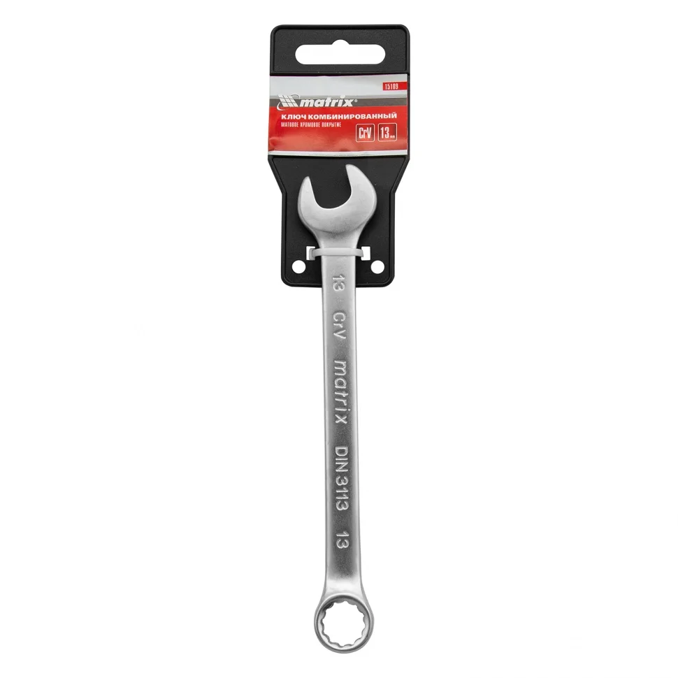 Ключ комбинированный Matrix 15109 из стали CrV, 13 мм, с покрытием «матовый хром»,пригодится при проведении ремонтных работ дома или в гараже. С его помощью можно осуществлять быстрый монтаж и демонтаж крепежных элементов. Кольцевой зев обеспечивает удобство работы благодаря углу наклона 15 градусов относительно плоскости инструмента.ПреимуществаКлюч из хромованадиевой стали обладает необходимыми прочностными характеристиками и высокой сопротивляемостью деформации.Рабочая часть ключа прошла закалку до твердости 45 HRC в соответствии с требованиями ГОСТа.Матовое хромовое покрытие защищает ключ от образования коррозии.Накидные части с 12-гранным профилем позволяют охватить крепеж по всей поверхности, за счет чего снижается риск деформации его граней.Ключ удобно хранить и он не потеряется во время транспортировки, т.к. упакован в пластиковый держатель.