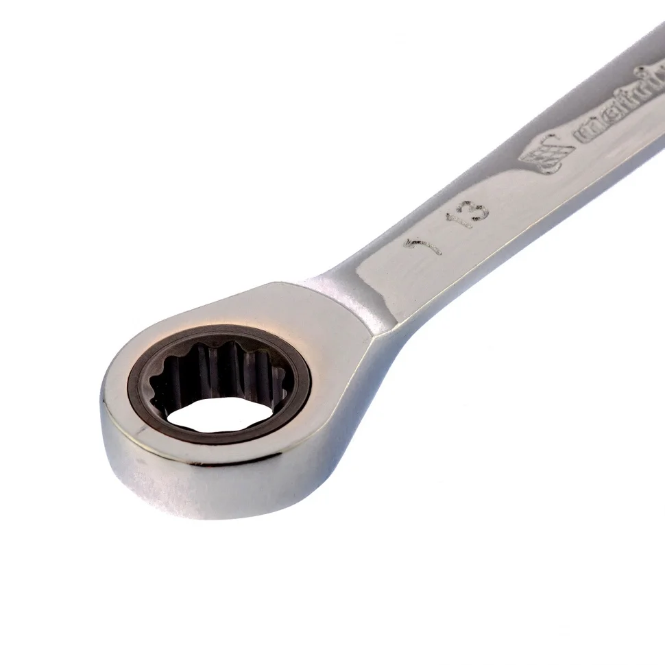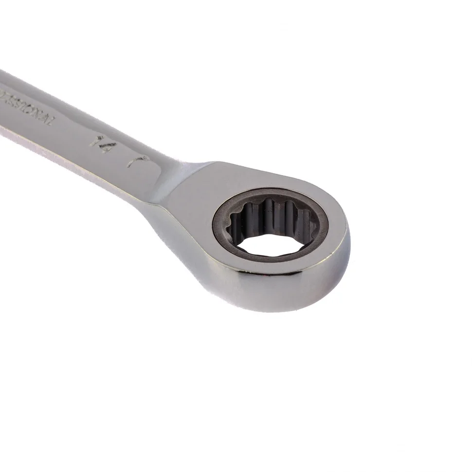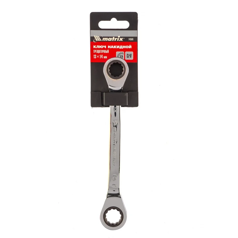 Накидной трещоточный ключ Matrix 14506, CrV, с покрытием из зеркального хрома, пригодится частным мастерам и профессионалам для монтажа и демонтажа резьбовых соединений размером 13 и 14 мм. Ключ будет полезен для работ в гараже, на производстве, строительной площадке, в быту. Трещоточный механизм с 72 зубьями повышает эффективность и скорость закручивания/откручивания болтов, гаек и т.д. Минимальный угол поворота инструмента составляет 5 градусов, поэтому производить работы можно в ограниченном пространстве.ПреимуществаПрочность и долговечность — ключ выполнен из высококачественной хромованадиевой стали (40CrV).Высокая твердость — храповый механизм закален до 41-46 HRC, это обеспечивает стойкость инструмента к нагрузкам.Две рабочие части с кольцевым профилем — легко работать с тугим и закисшим крепежом, поскольку ключ полностью охватывает его.Круглый зев с 12 гранями — риск повреждения граней крепежа минимизирован, т.к. ключ обеспечивает увеличенную зону контакта с деталями.Зеркальное хромоникелевое покрытие — исключено образование коррозии на корпусе при контакте с водой и другими жидкостями.Легкое обслуживание — ключ с зеркальной поверхностью легко чистить, достаточно протереть его тканью после работы.
