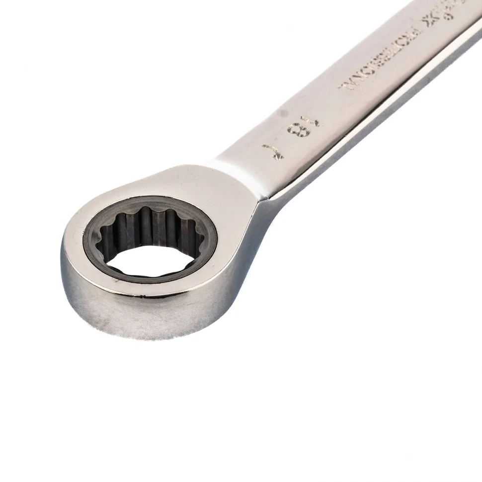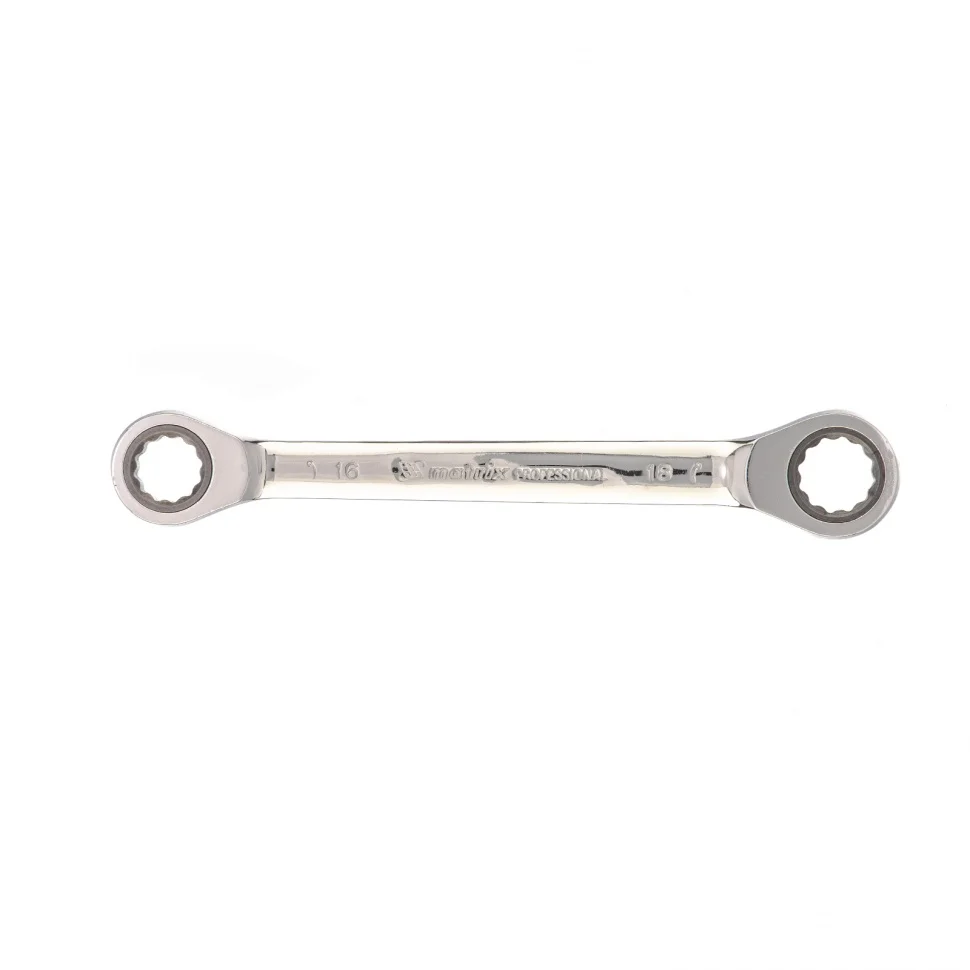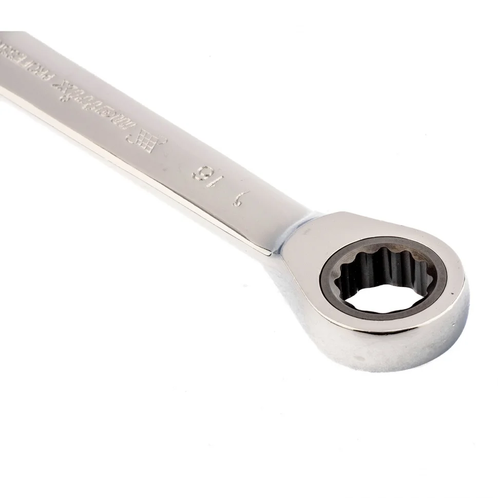Накидной трещоточный ключ Matrix 14510, CrV, с покрытием из зеркального хрома, пригодится частным мастерам и профессионалам для монтажа и демонтажа резьбовых соединений размером 16 и 18 мм. Ключ будет полезен для работ в гараже, на производстве, строительной площадке, в быту. Трещоточный механизм с 72 зубьями повышает эффективность и скорость закручивания/откручивания болтов, гаек и т.д. Минимальный угол поворота инструмента составляет 5 градусов, поэтому производить работы можно в ограниченном пространстве.ПреимуществаПрочность и долговечность — ключ выполнен из высококачественной хромованадиевой стали (40CrV).Высокая твердость — храповый механизм закален до 41-46 HRC, это обеспечивает стойкость инструмента к нагрузкам.Две рабочие части с кольцевым профилем — легко работать с тугим и закисшим крепежом, поскольку ключ полностью охватывает его.Круглый зев с 12 гранями — риск повреждения граней крепежа минимизирован, т.к. ключ обеспечивает увеличенную зону контакта с деталями.Зеркальное хромоникелевое покрытие — исключено образование коррозии на корпусе при контакте с водой и другими жидкостями.Легкое обслуживание — ключ с зеркальной поверхностью легко чистить, достаточно протереть его тканью после работы.