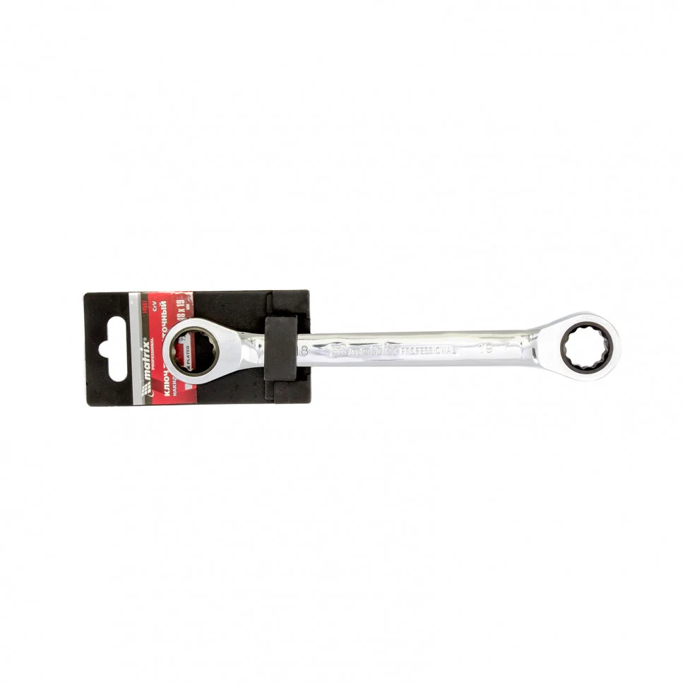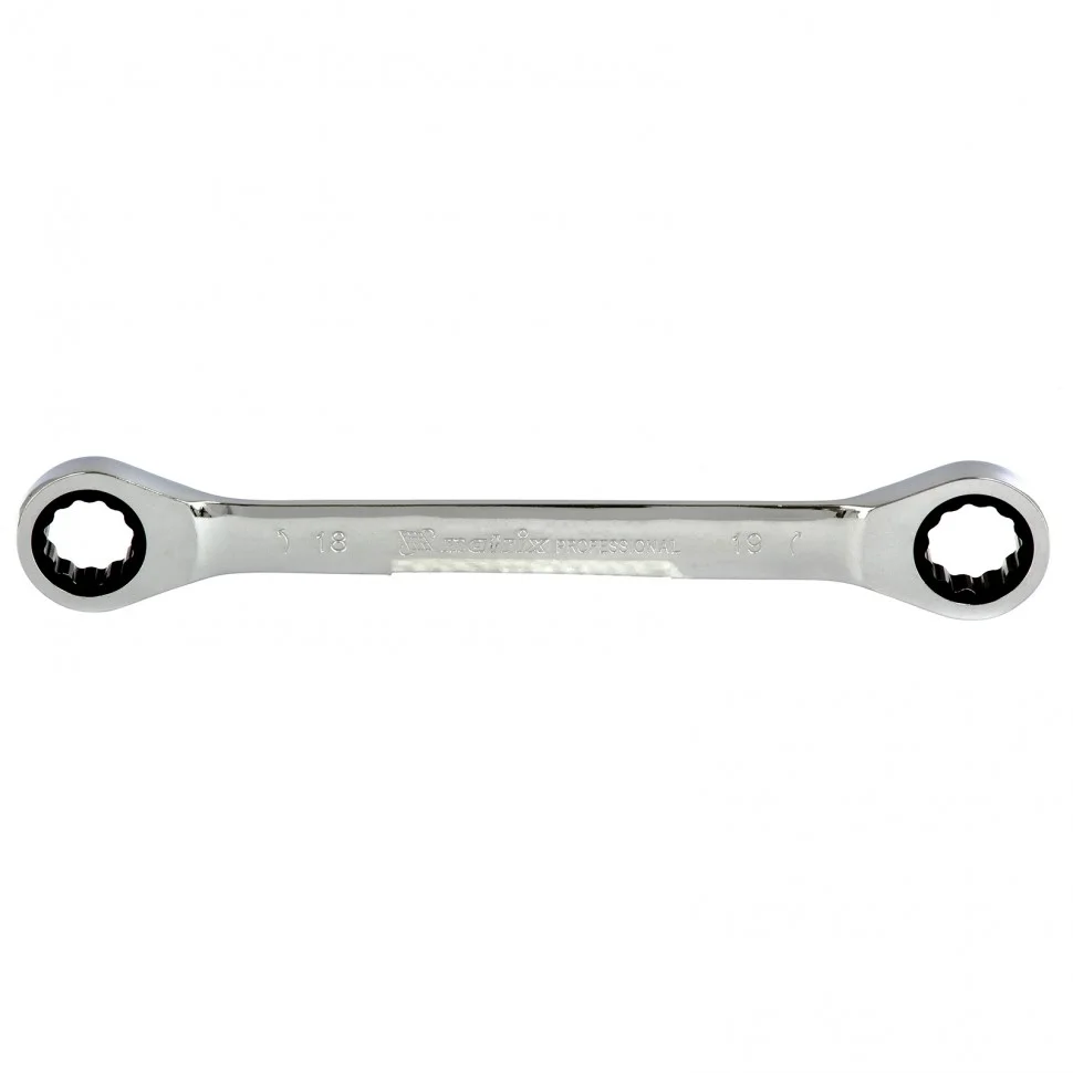 Ключ изготовлен из высококачественной стали 40CrV1.Имеет хромоникелевое антикоррозионное покрытие.Твердость материала храпового механизма 58 HRС.Ключ имеет два кольцевых зева различных размеров.Профиль накидной части ключа имеет 12 граней, что увеличивает площадь соприкосновения рабочих поверхностей и снижает риск деформации граней крепежа.В кольцевой профиль ключа установлен специальный храповой механизм (трещотка) с 72 зубцами, который обеспечивает легкий ход инструмента, быстрый и удобный монтаж резьбовых соединений.Минимальный угол поворота ключа 5 градусов.Ключ гаечный накидной двусторонний с трещотками предназначен для эффективного откручивания и закручивания болтовых соединений.