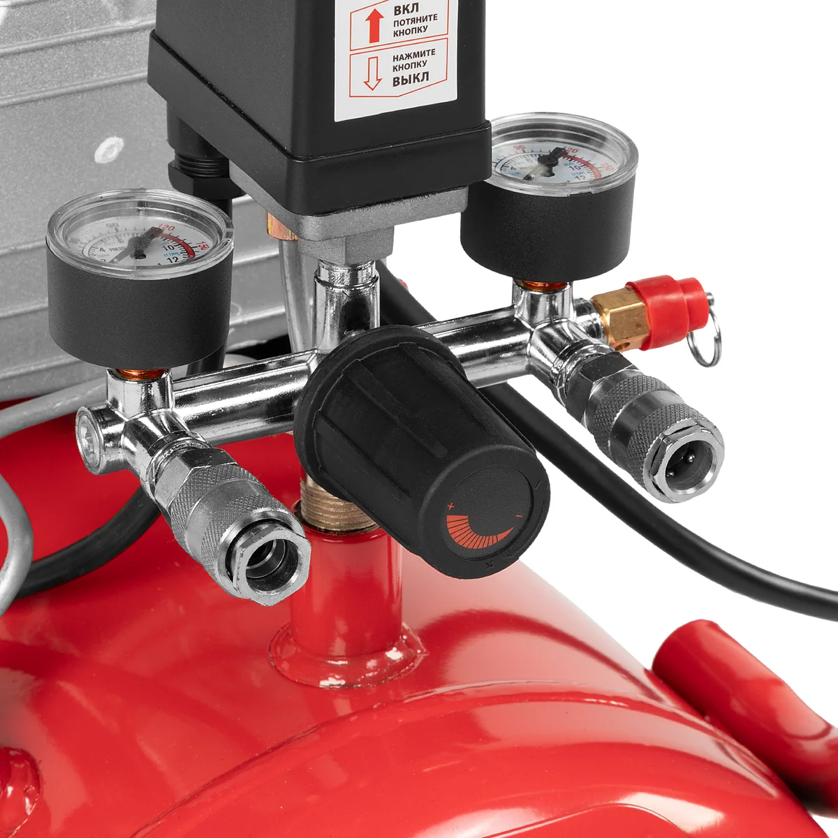 - Удобный контроль рабочих параметров — 2 манометра и регулятор позволяют отслеживать и корректировать давление для корректной работы пневмоинструмента.