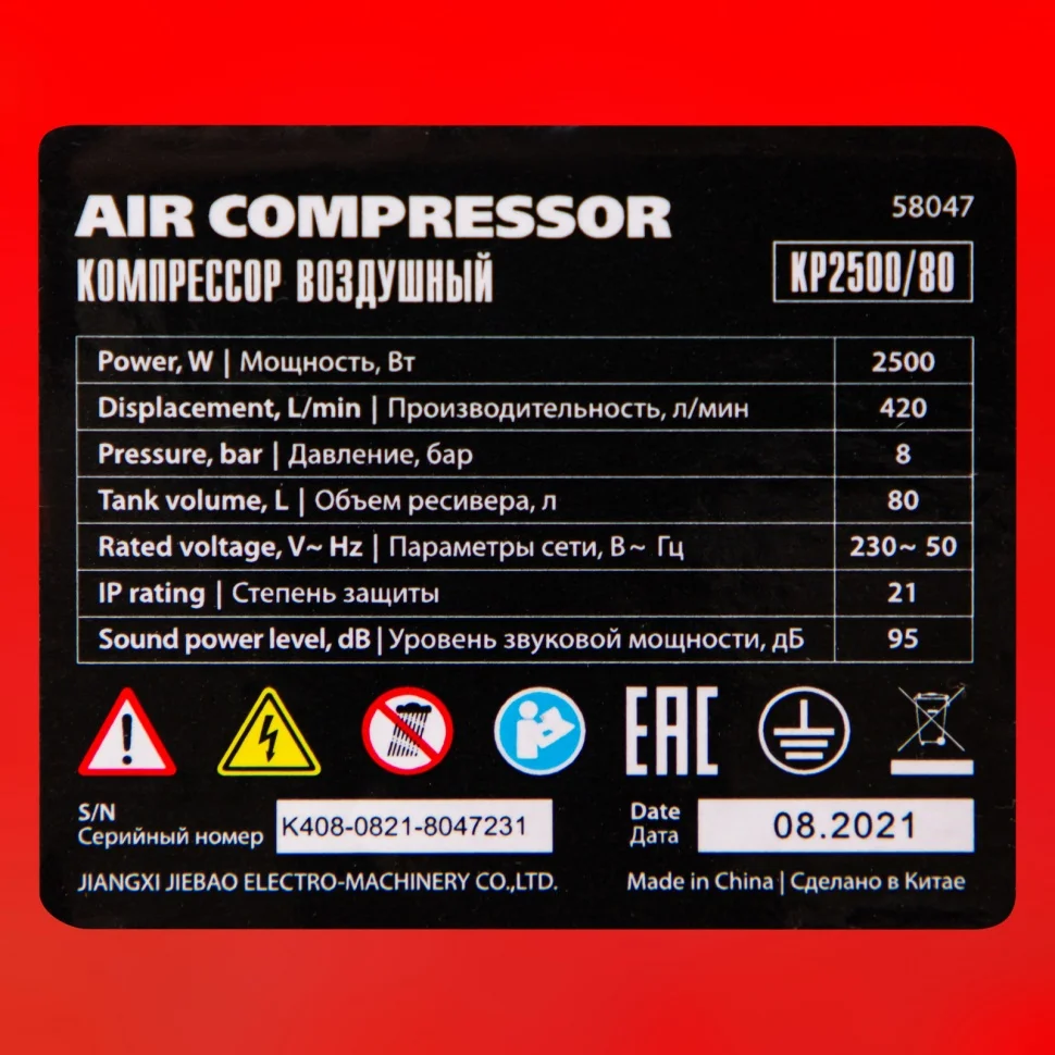 - Готовность к работе — комплект крепежа, колеса, сапун и компрессорное минеральное масло марки DAA100 (500 мл) входят в комплект поставки.
