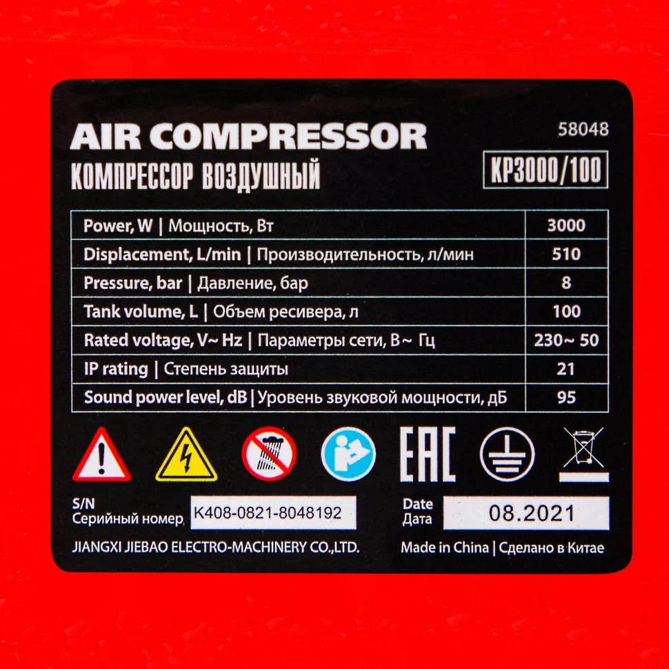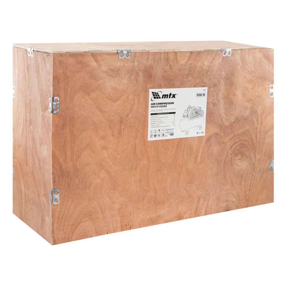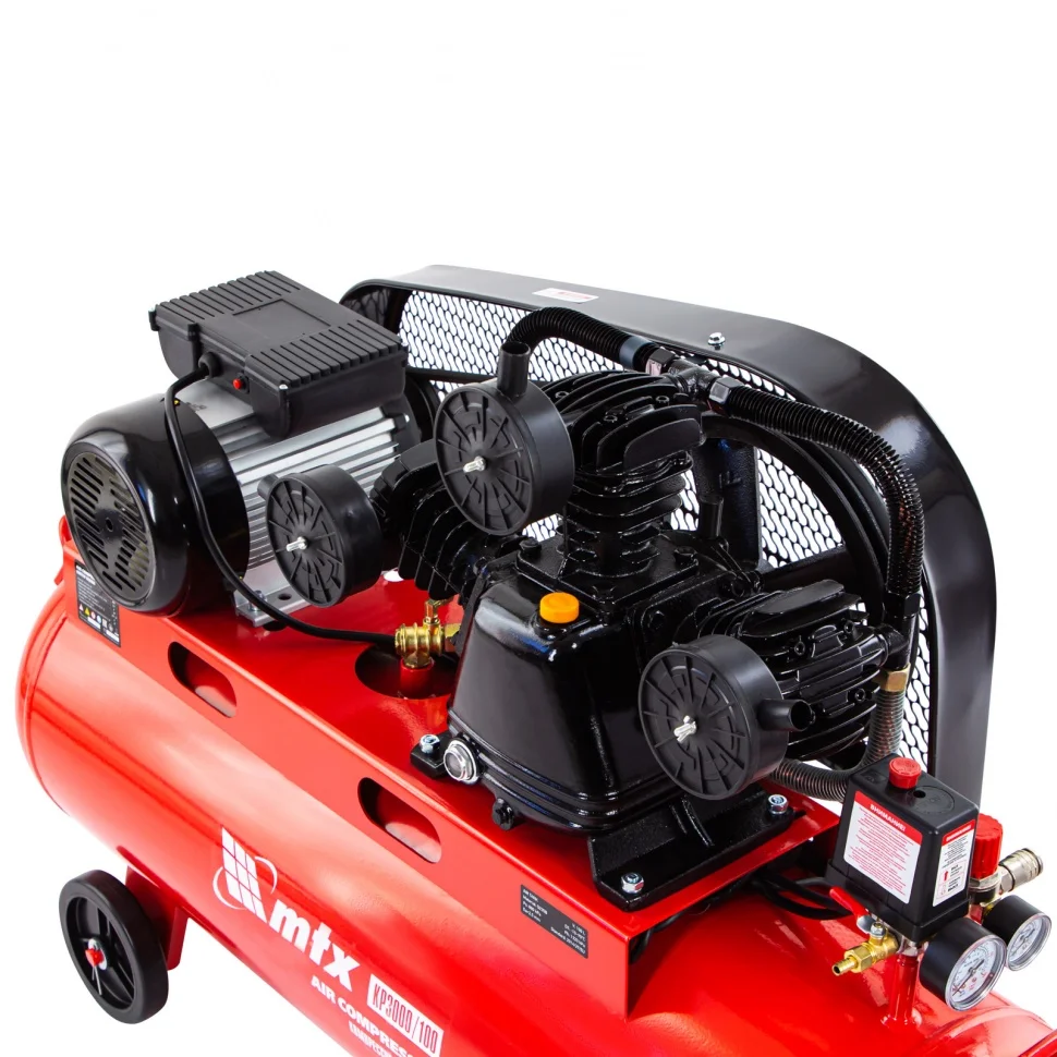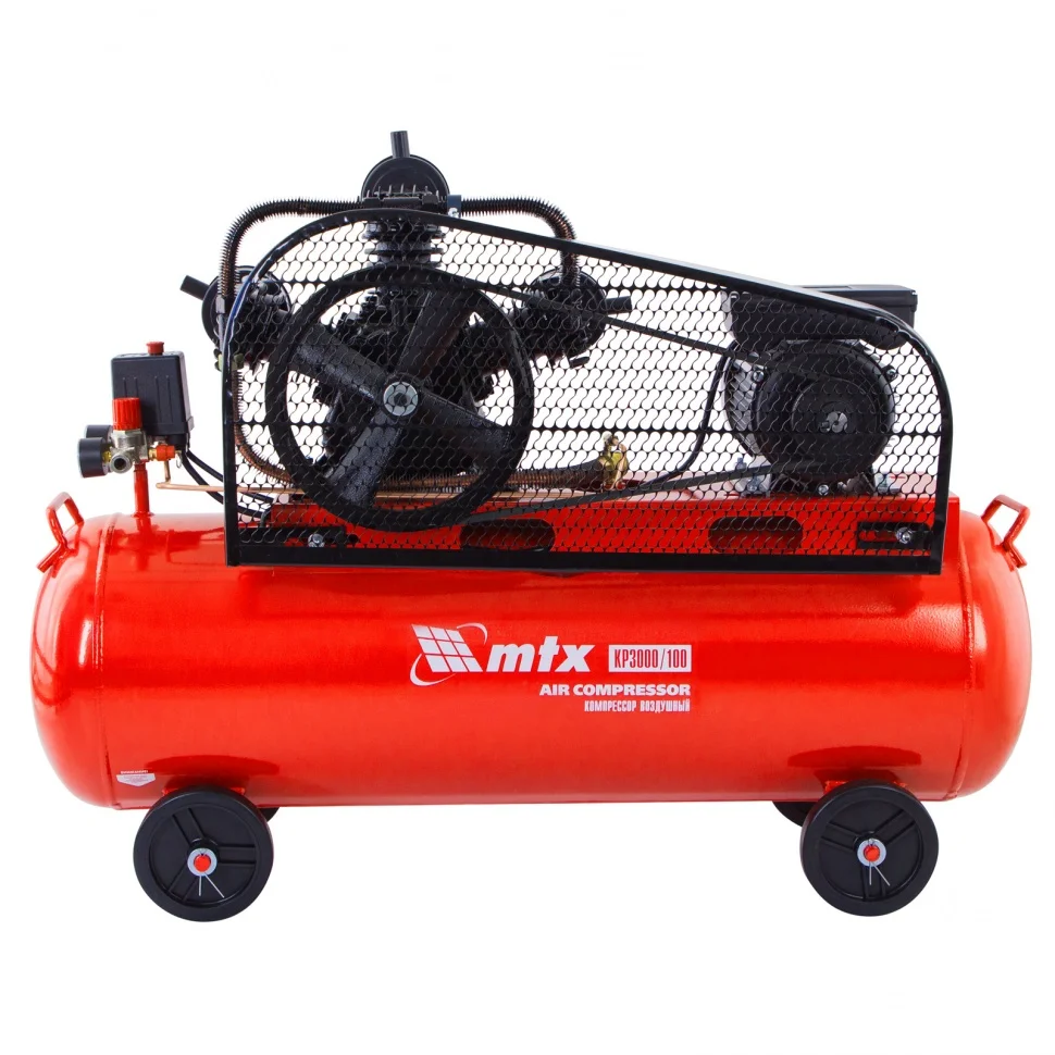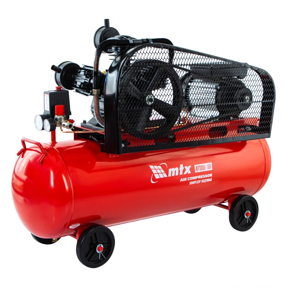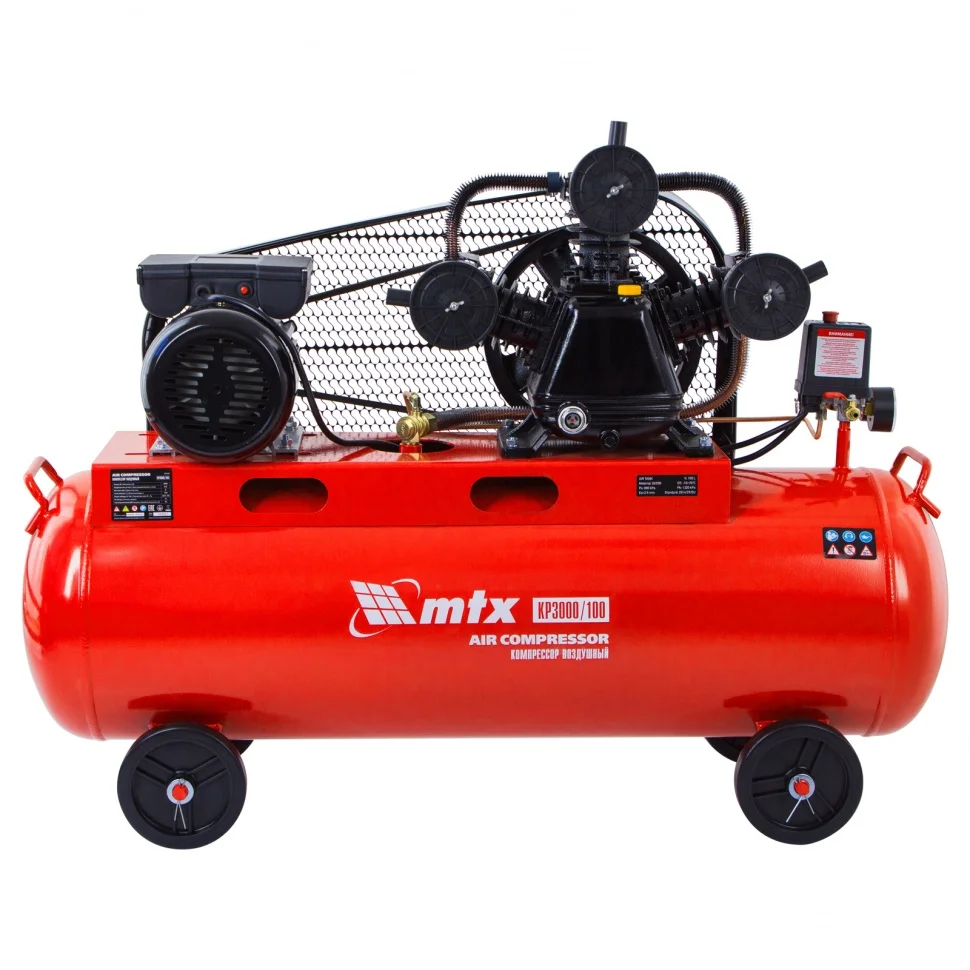 Компрессор воздушный МТХ КР3000/100, 58048, с ременным приводом от электродвигателя, мощностью 3,0 кВт и производительностью 510 л/мин, с ресивером объемом 100 литров, применяется для подачи сжатого атмосферного воздуха в пневматические инструменты. К нему можно подключать гайковерт, дрель, степлер, краскопульт, продувочный пистолет и т.п.ПреимуществаБезопасность — защита от перегрузки позволяет избежать аварийные ситуации.Защитный клапан — превышение максимально допустимого давления в ресивере исключено.Реле давления — автоматическая регулировка работы с помощью периодических остановок/запуска двигателя позволяет поддерживать стабильную производительность.Повышенный ресурс — чугунный блок цилиндра увеличивает срок эксплуатации компрессора.Увеличенная емкость масляного картера — все детали воздушного компрессора обеспечены достаточной смазкой.Оснащение двумя манометрами — устройства позволяют контролировать давление сжатого воздуха в воздухосборнике и в пневмомагистрали.Простая подготовка к работе — с помощью быстросъемного коннектора пневмооборудование легко подключить.Мобильность — для удобного перемещения компрессор оснащен колесами и ручкой.Низкий уровень шума — значение звуковой мощности не превышает 95 дБ.Готовность к работе — комплект крепежа, колеса, сапун и компрессорное минеральное масло марки DAA100 (500 мл) входят в комплект поставки.
