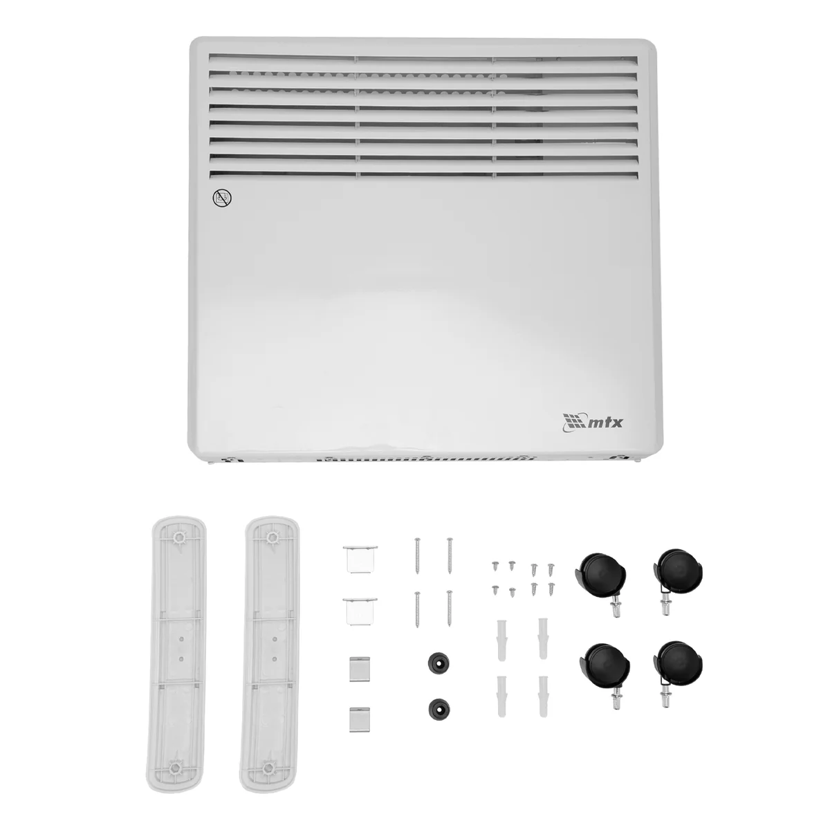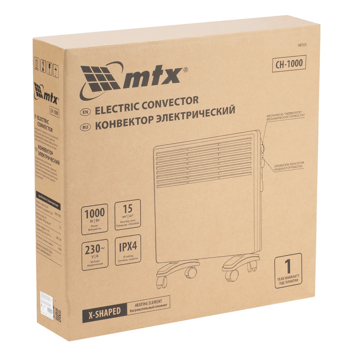 Электрический конвектор MTX CH-1000 98105 максимальной мощностью 1000 Вт, с X-образным нагревателем, термостатом и колесами, — источник тепла для жилых, офисных и хозяйственных помещений. X-образный нагревательный элемент позволяет быстро и равномерно нагреть помещение до нужной температуры. Площадь обогрева составляет 15 м2.